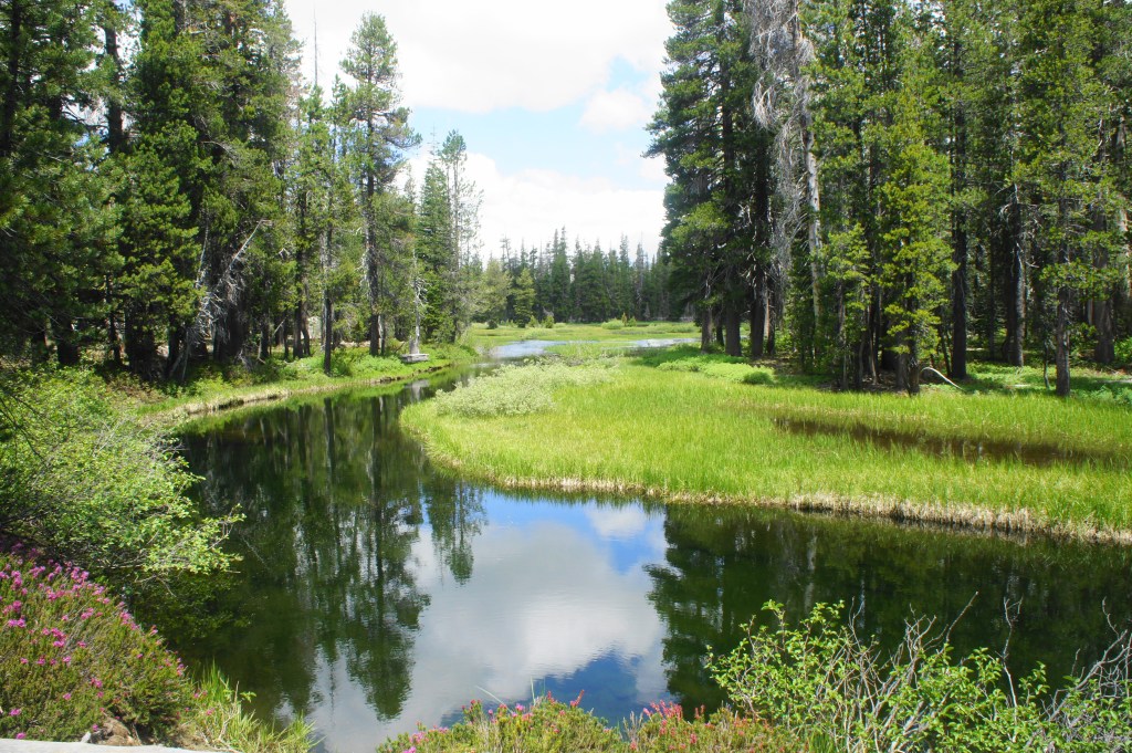 Take the path to the south bank of a marshy stream, where there is a bulletin board and four-way junction. One can head straight across the bridge known as Chapel Crossing, but the quickest route toward Desolation Wilderness heads right, skirting the creek and passing wet meadows on the left. The trail crosses a short bridge over a tributary and then courses northward to a junction at the base of the hike’s first prominent granite outcrop.