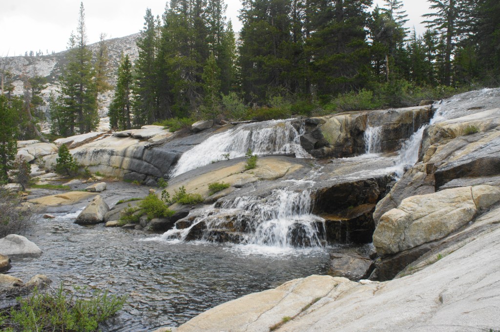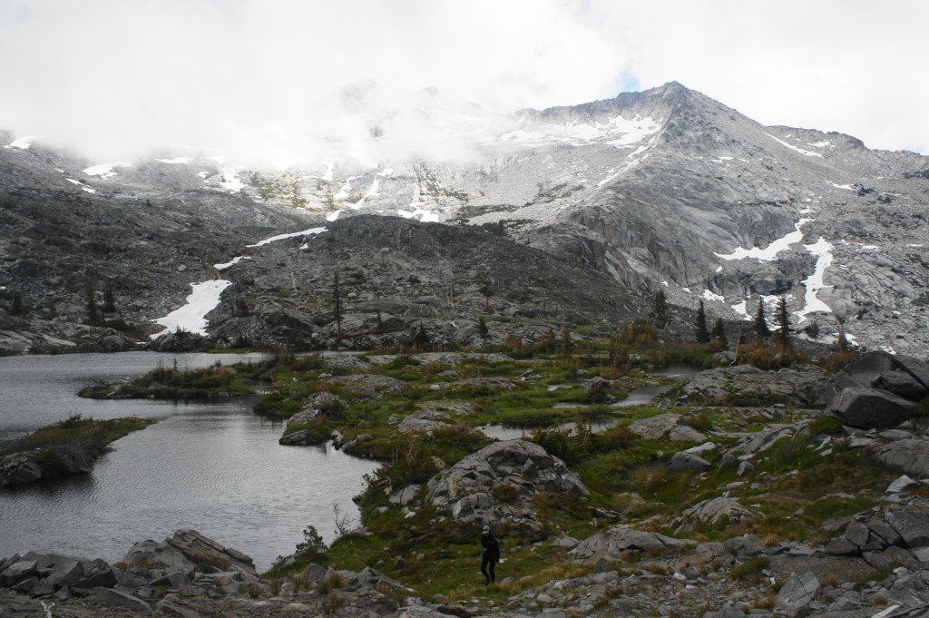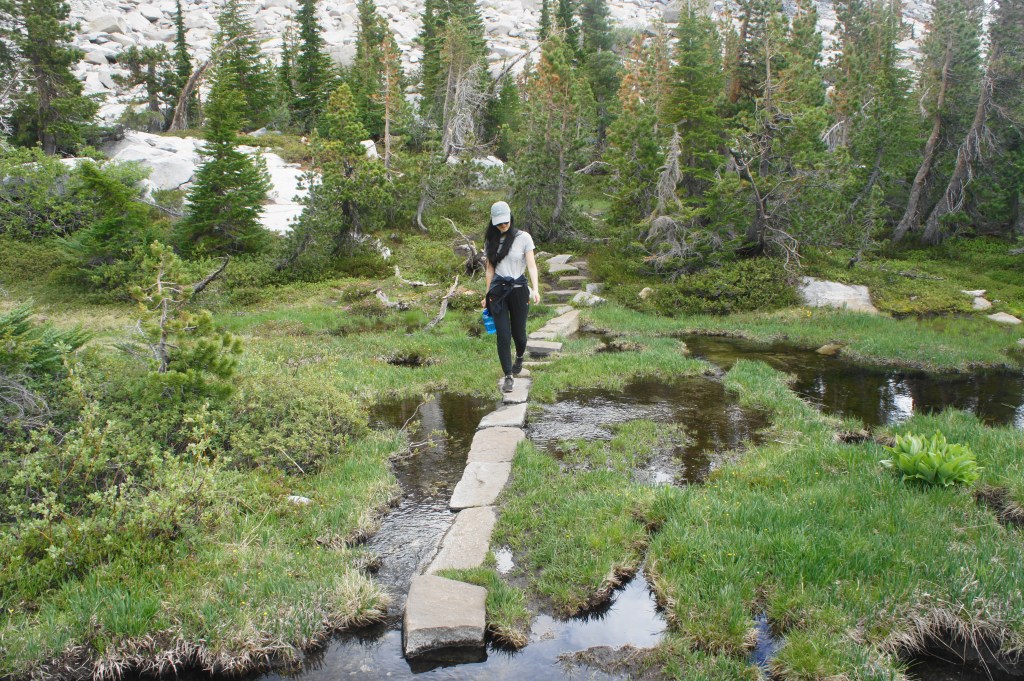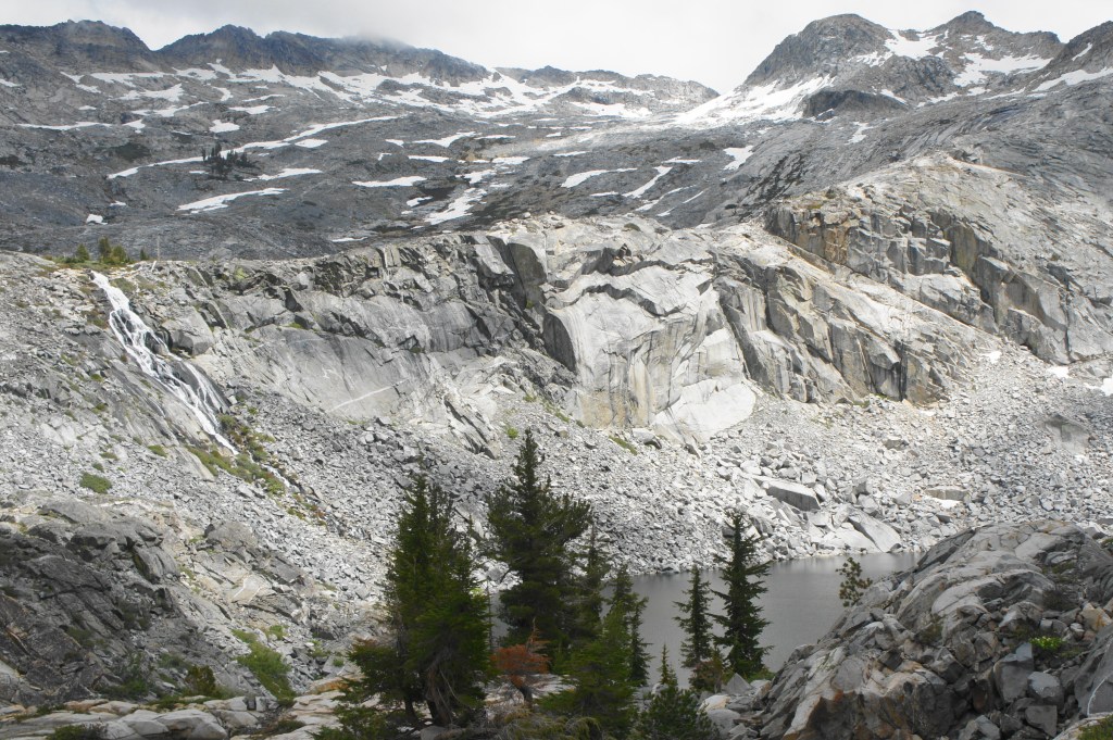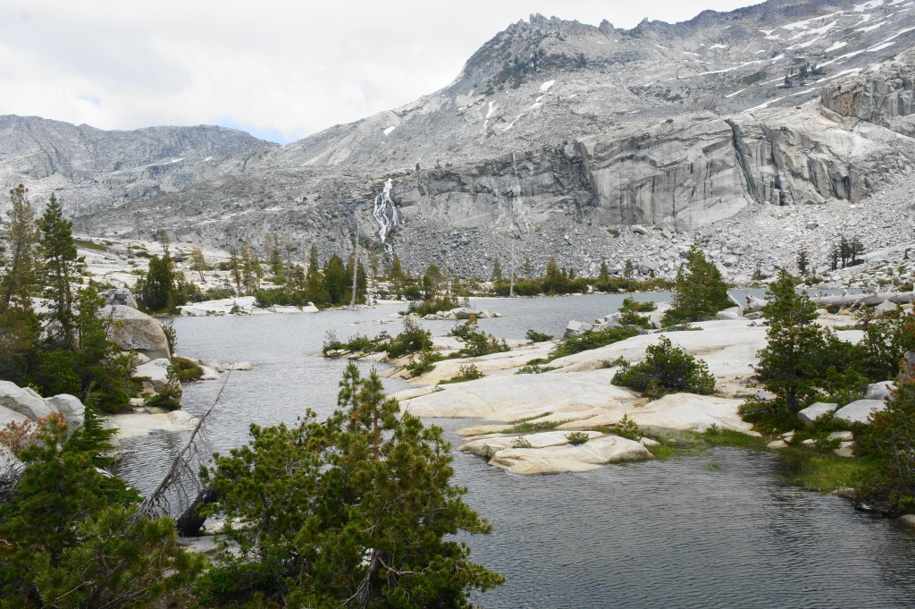 From here the onward route rises to a vista overlooking a bowl of granite ahead, after which the trail drops to streamside again, traversing a coniferous moraine that includes meadows, marshes, and small pools from the seasonal snowmelt.