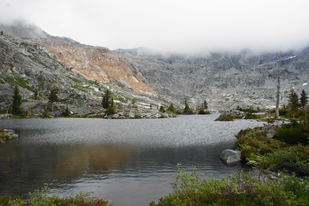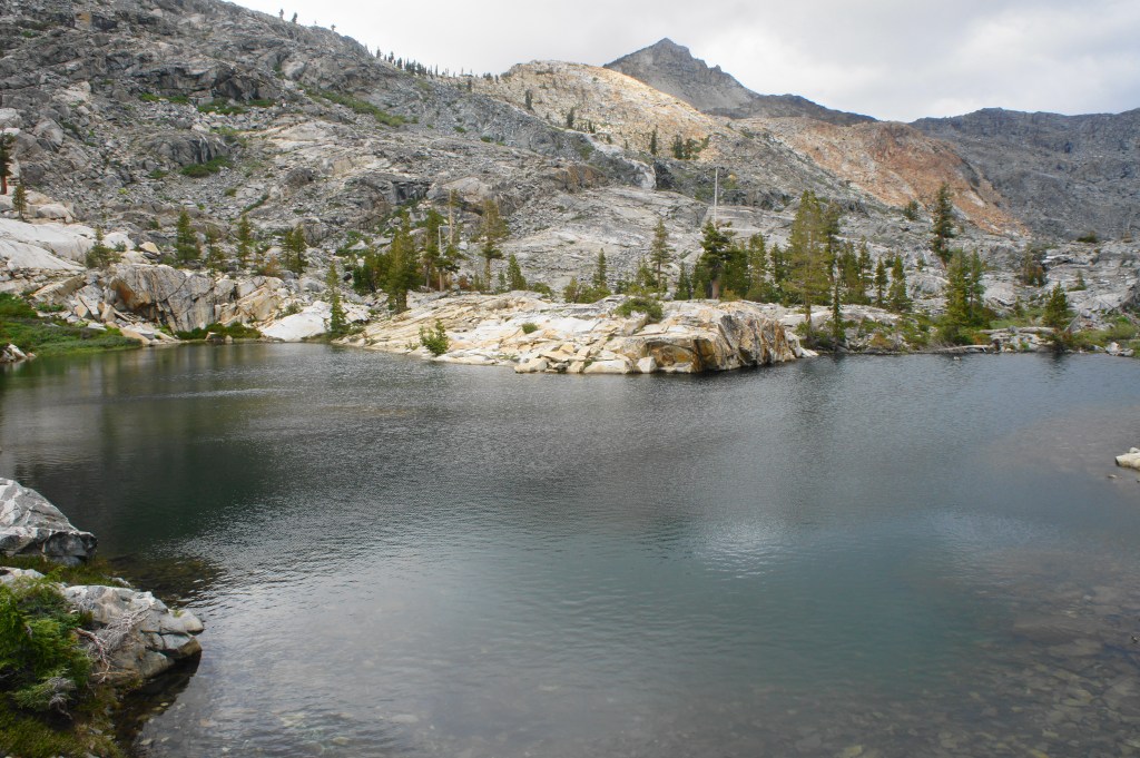 Island Lake is the largest lake (besides Wrights Lake) visited on the hike and is named for its various islets scattered across the water. The lake’s eastern shores signal the end of the trail, with onward passage obstructed by high walls and scree fields. This lake is situated deep in the Crystal Range, surrounding on three sides by towering peaks and knobs rising to nearly 9,500 feet above sea level. Although still relatively low elevation by Sierra Nevada standards, this looks and feels like high alpine terrain.