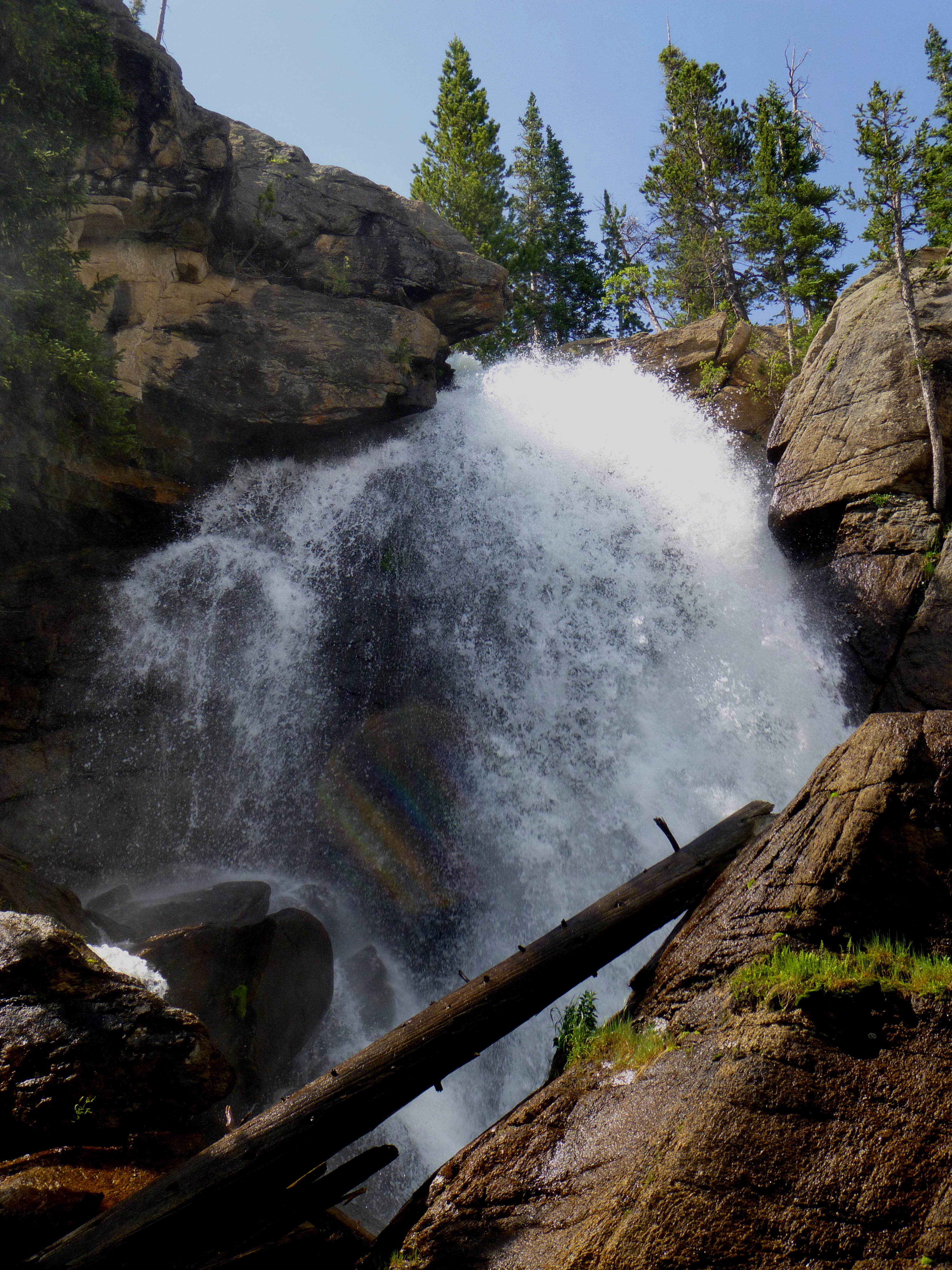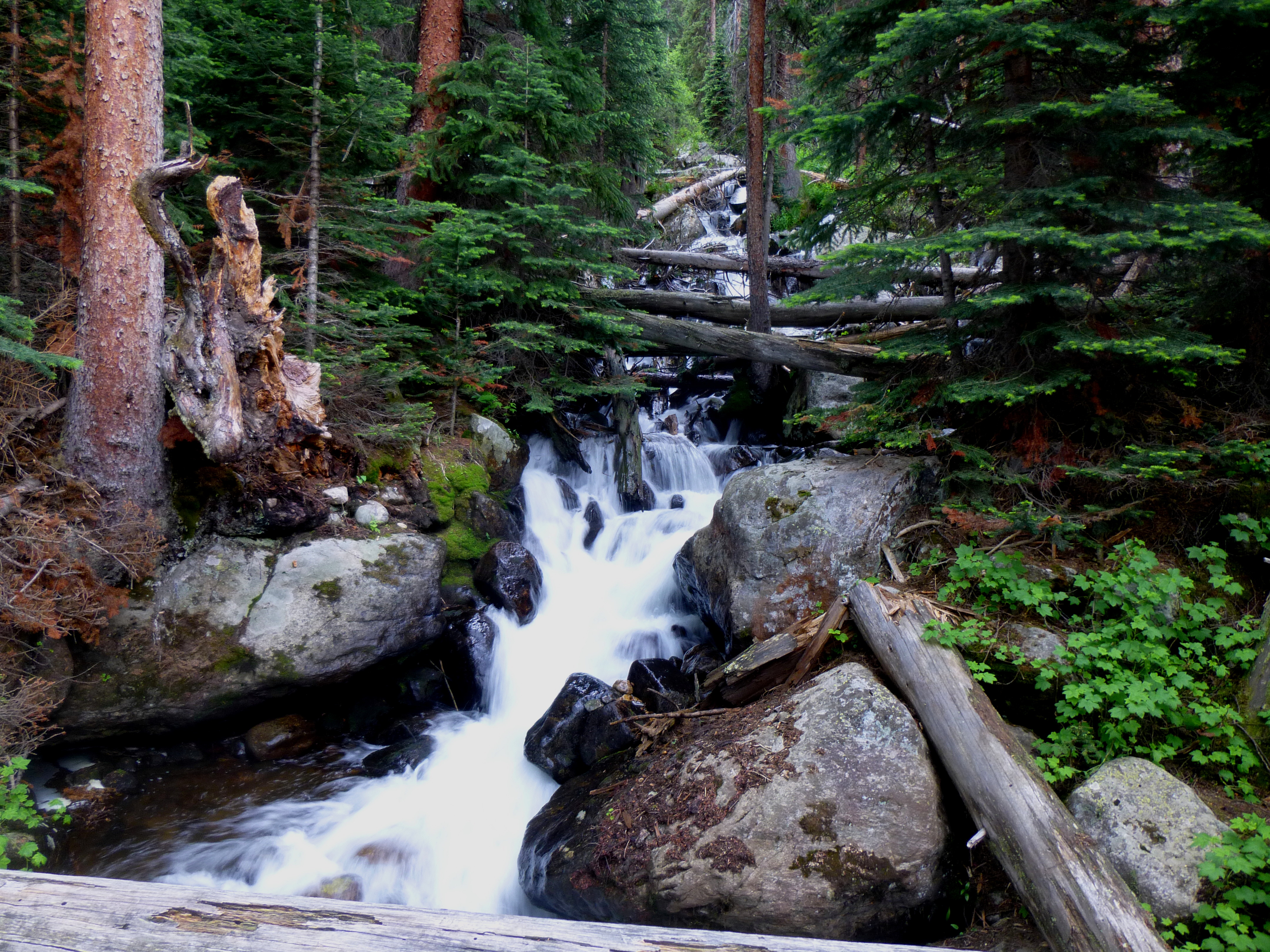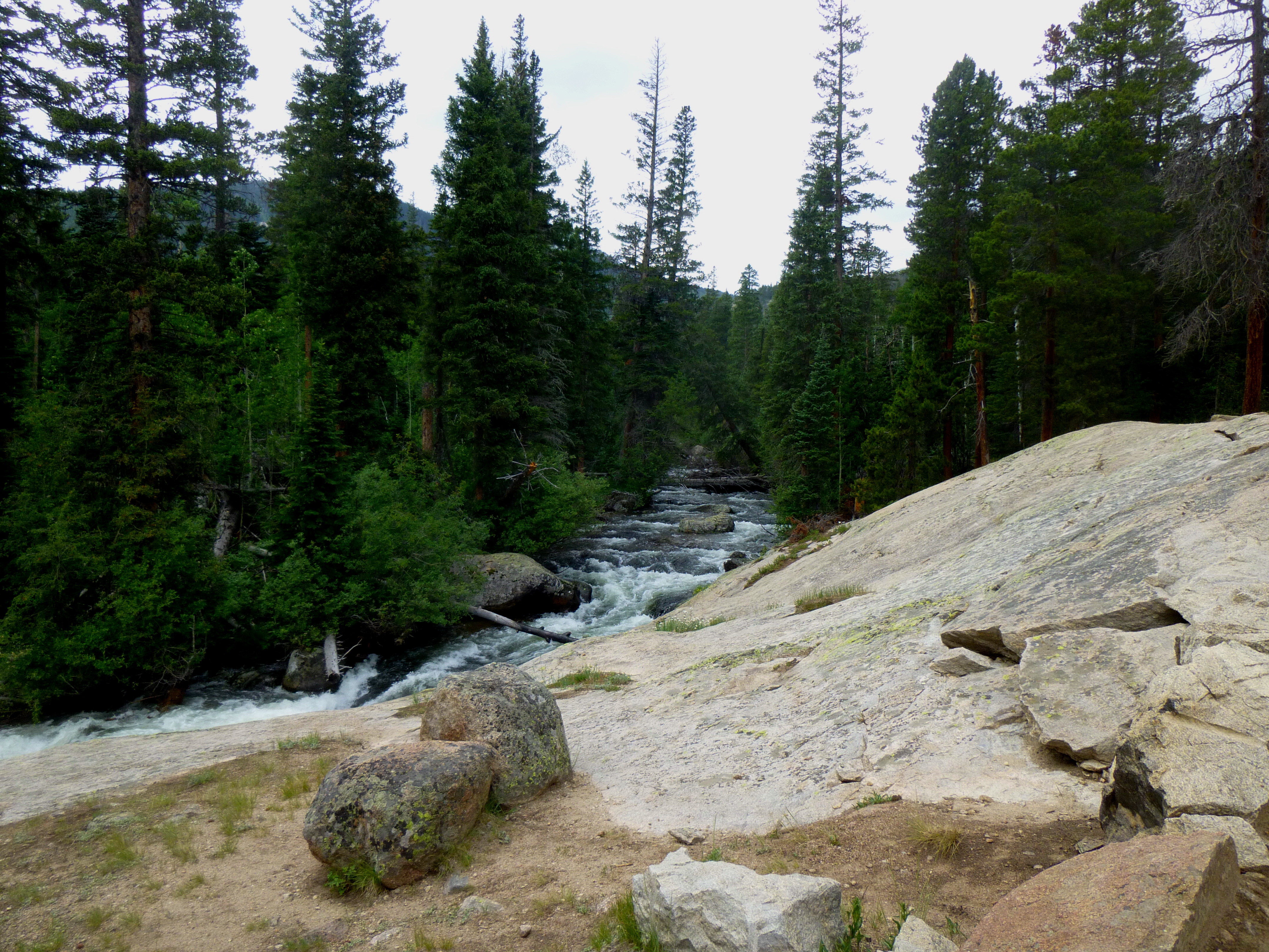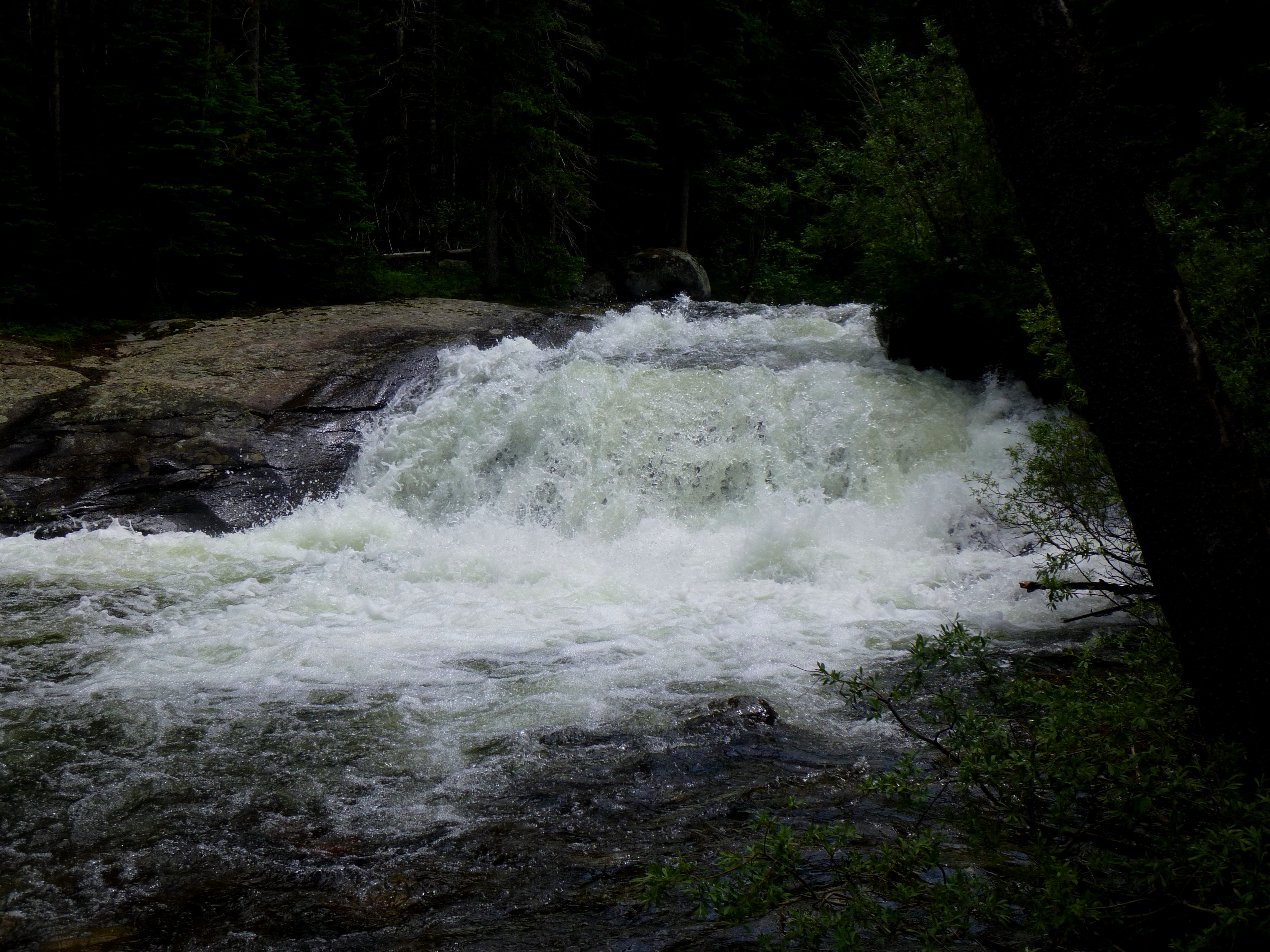 Continue off to the right, where the spur route quickly meets up again with the wide, well-maintained main trail. The first 1.4 miles from Wild Basin TH are quite easy, mostly flat with the occasional gently-sloping uphill. While predominantly forest-covered, the rocky path periodically abuts North St. Vrain Creek. At virtually every vantage point, the creek is roaring wildly over rocks and falling logs.