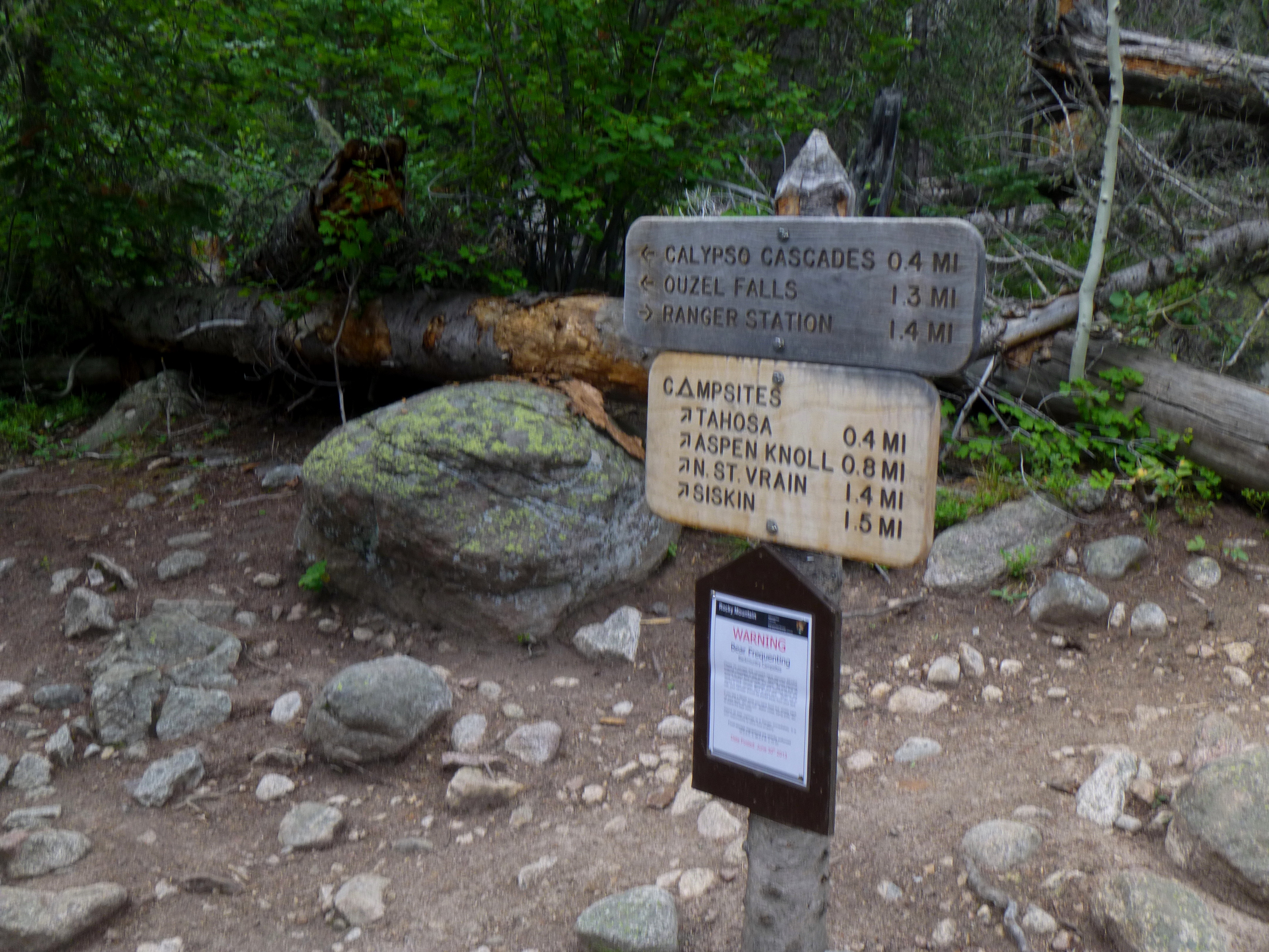0.2 miles later, most of it an uphill slog, hikers again face an intersection. To the left, the Allenspark Trail leads 3.1 miles to Allenspark TH or 3.5 miles to Finch Lake. Best to save that for another day.