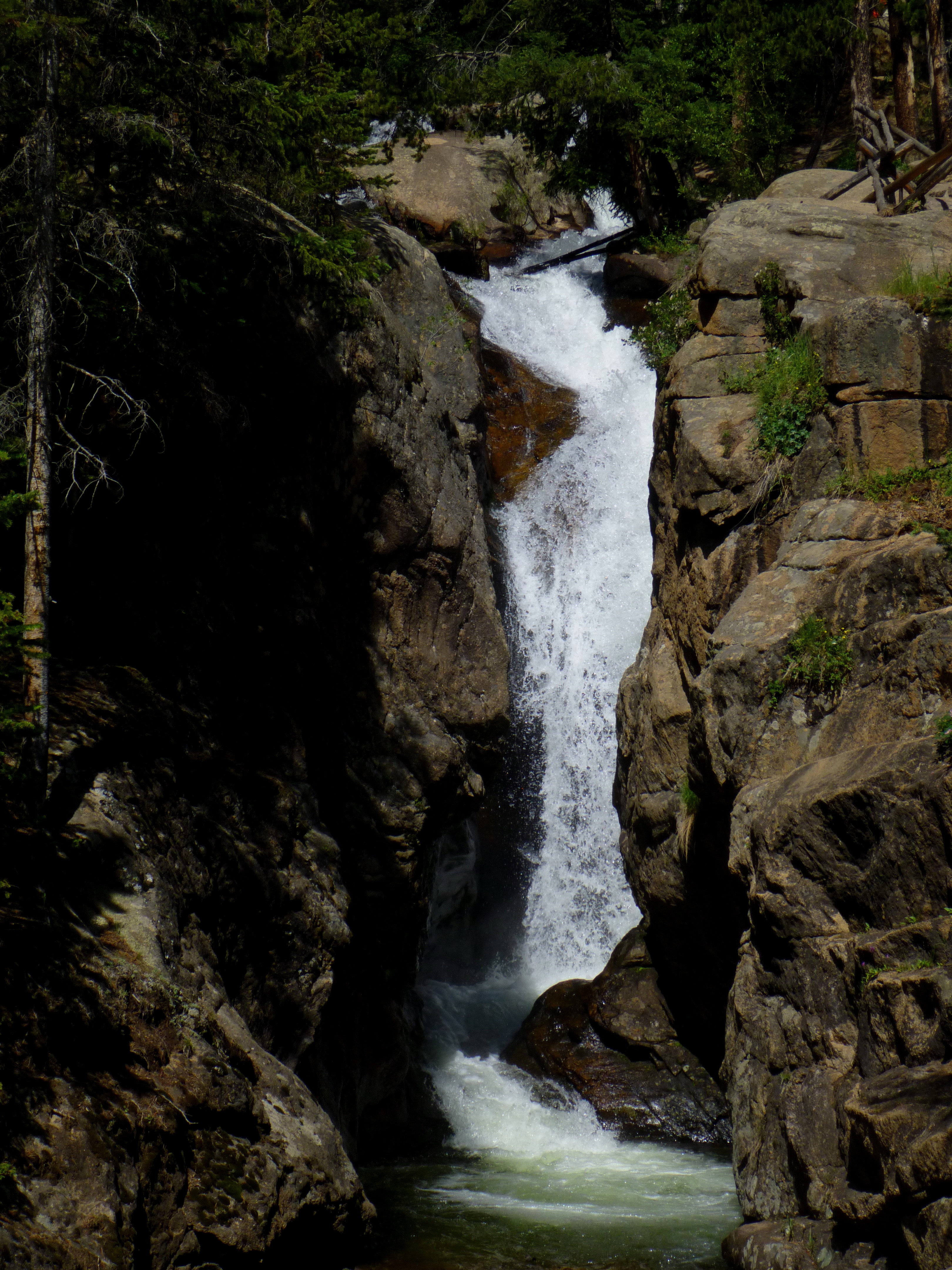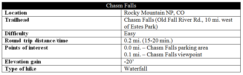 As visitors will know, the “hike” to Chasm Falls is not much of a hike at all. Rather, it is a pleasant place to quickly stretch your legs (and get your heart pumping on the return ascent) on the drive up lovely Old Fall River Road. At the bottom of the short trail, visitors can gaze over the handrails at the 25-foot chute that carves through the rock on its way down toward Endovalley, Horseshoe Park, and beyond. The views to the east down Fall River are quite nice as well.