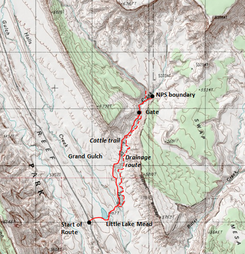 From Little Lake Mead, route options across the Grand Gulch abound. Keeping an eye on the goal (the obvious canyon to the north), you can either try your luck following a cattle trail that cuts through and around a number of cut banks or strike out on your own in a general northeastwardly direction. Keep in mind that, in addition to a number of tributary washes, there are two main drainages (see map above): it is the second (easternmost) wash that should serve as your North Star.