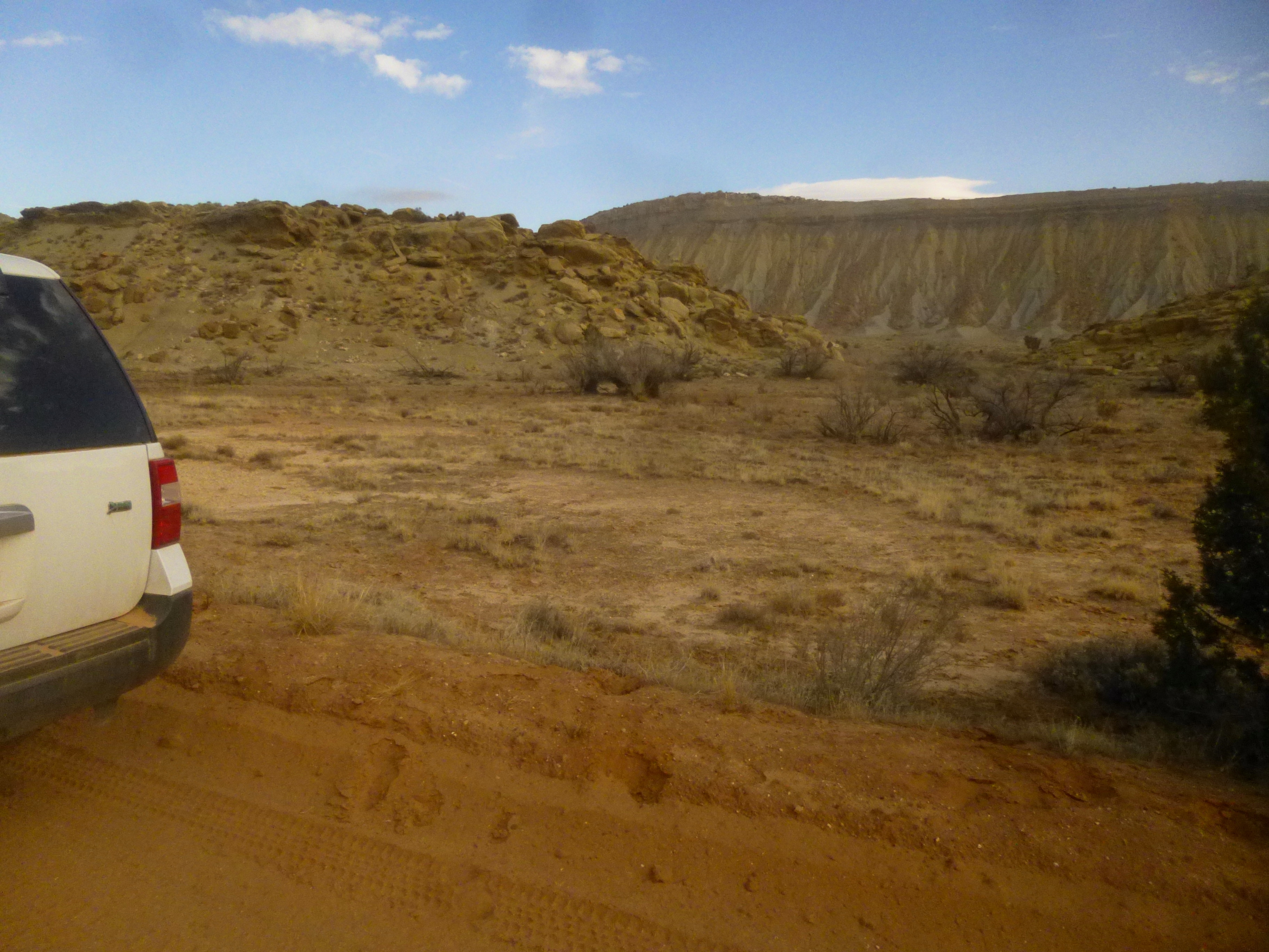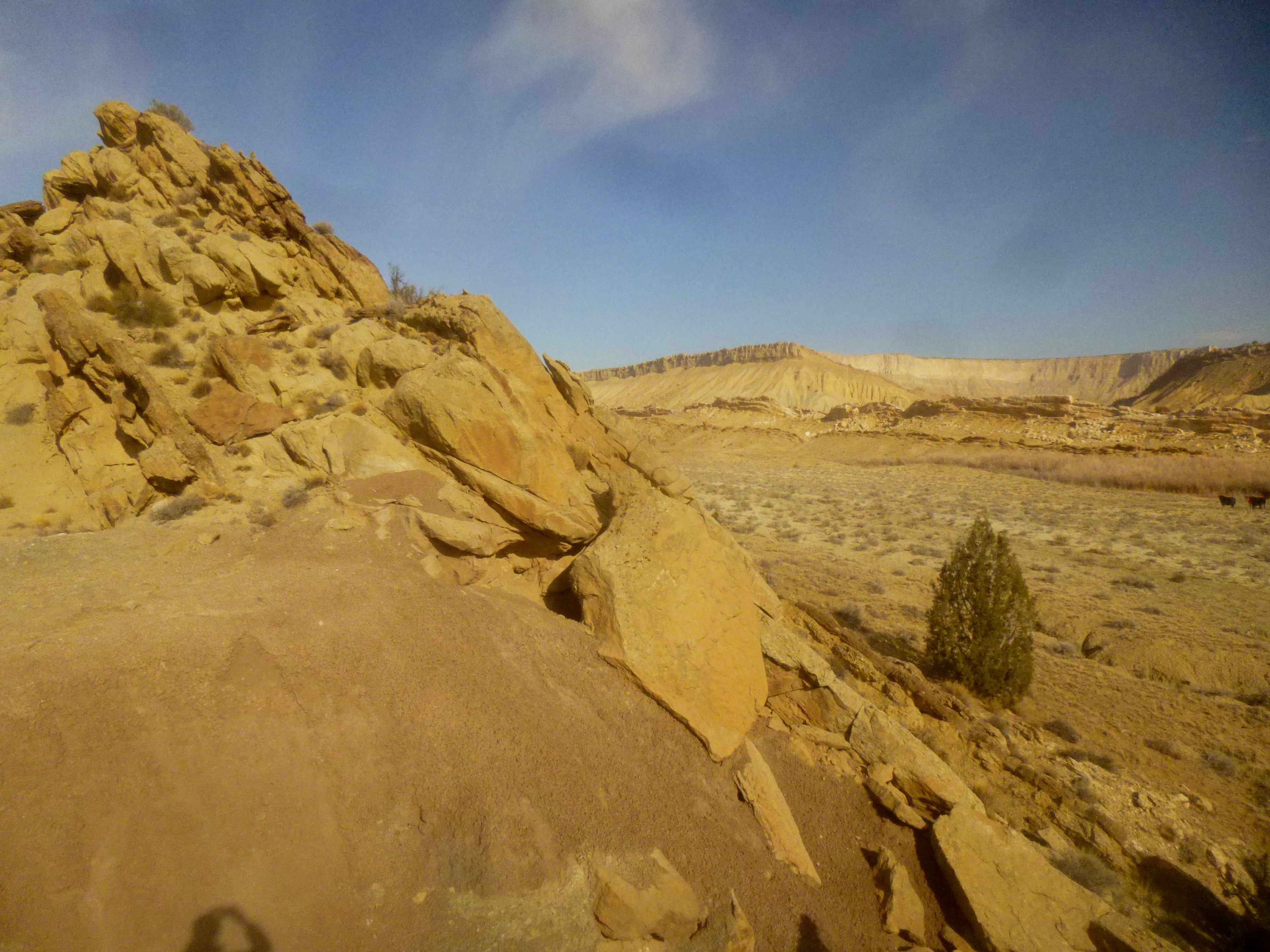 Beyond the faux boundary fence, a faint trail leading up a small ridge appears on the opposite side of the creek. Unfortunately, reaching it requires pushing through the crowded grove of willows, but from this direction, there are a couple suitable paths. Once on the other side, the scenery gets noticeably more intriguing, as you can now clearly see a new layer of the Mancos shale: the colorful Emery member. This rock formation is responsible for the golden-orange cliffs above to the right. Straight ahead, the massive hunk known as Tarantula Mesa (6,300’) shines in the early afternoon sun.