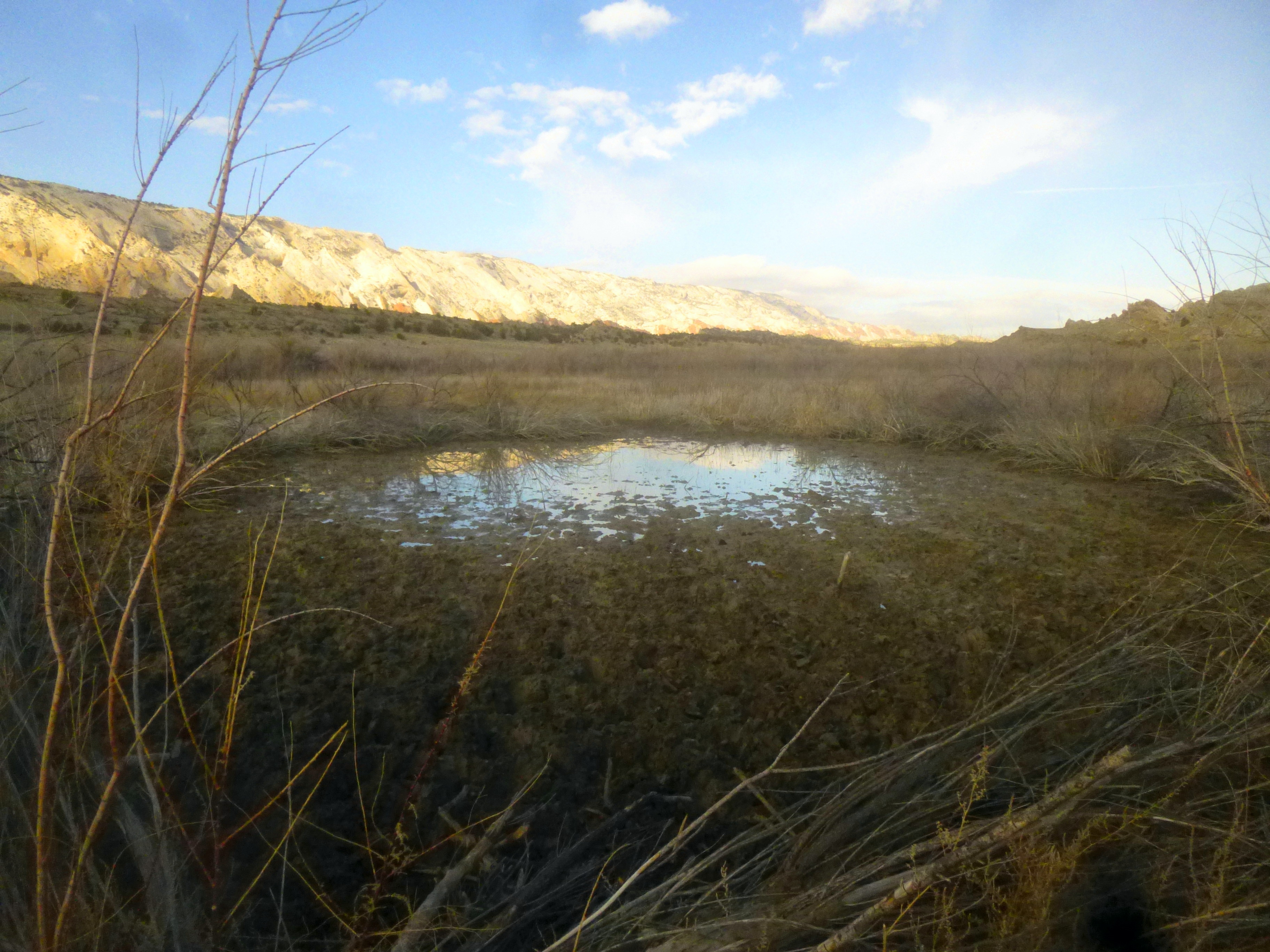 Skirting the southern edge of the “lake” (when I was there, it was simply a collection of mud and brush, with a tiny pool of standing water maybe 20 feet wide), there is an old metal register revealing the pond’s true name: Bitter Creek Reservoir, constructed 1945. As this is one of only a handful of watering holes in the area, you are likely to encounter a herd of cattle grazing around the lake in the winter. On the day my colleague Sandy and I explored this route, the bovine creatures eyed us with suspicion: it’s not too often they see humans around these parts.