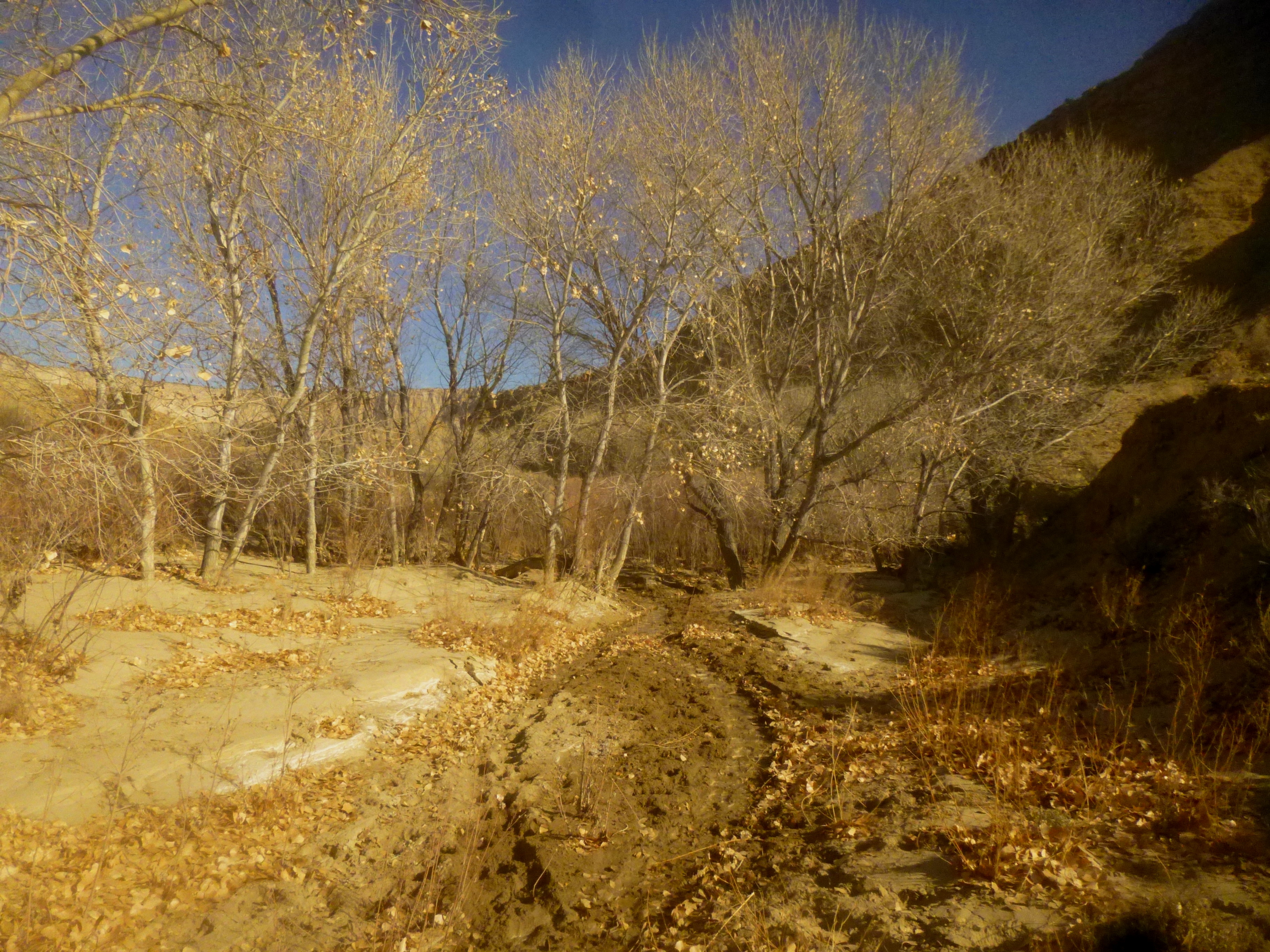 There are again a number of route options from here, corresponding with three drainages (two were dry when we hiked in December). The furthest east—a dry wash—leads 1/5 mile to an obvious wooden fence: the true park boundary. The middle option follows the water (here it is flowing rather well, up to 6 or 8 inches deep in some places) through a brushy wash, also leading to the park boundary in about 3/10 mile.