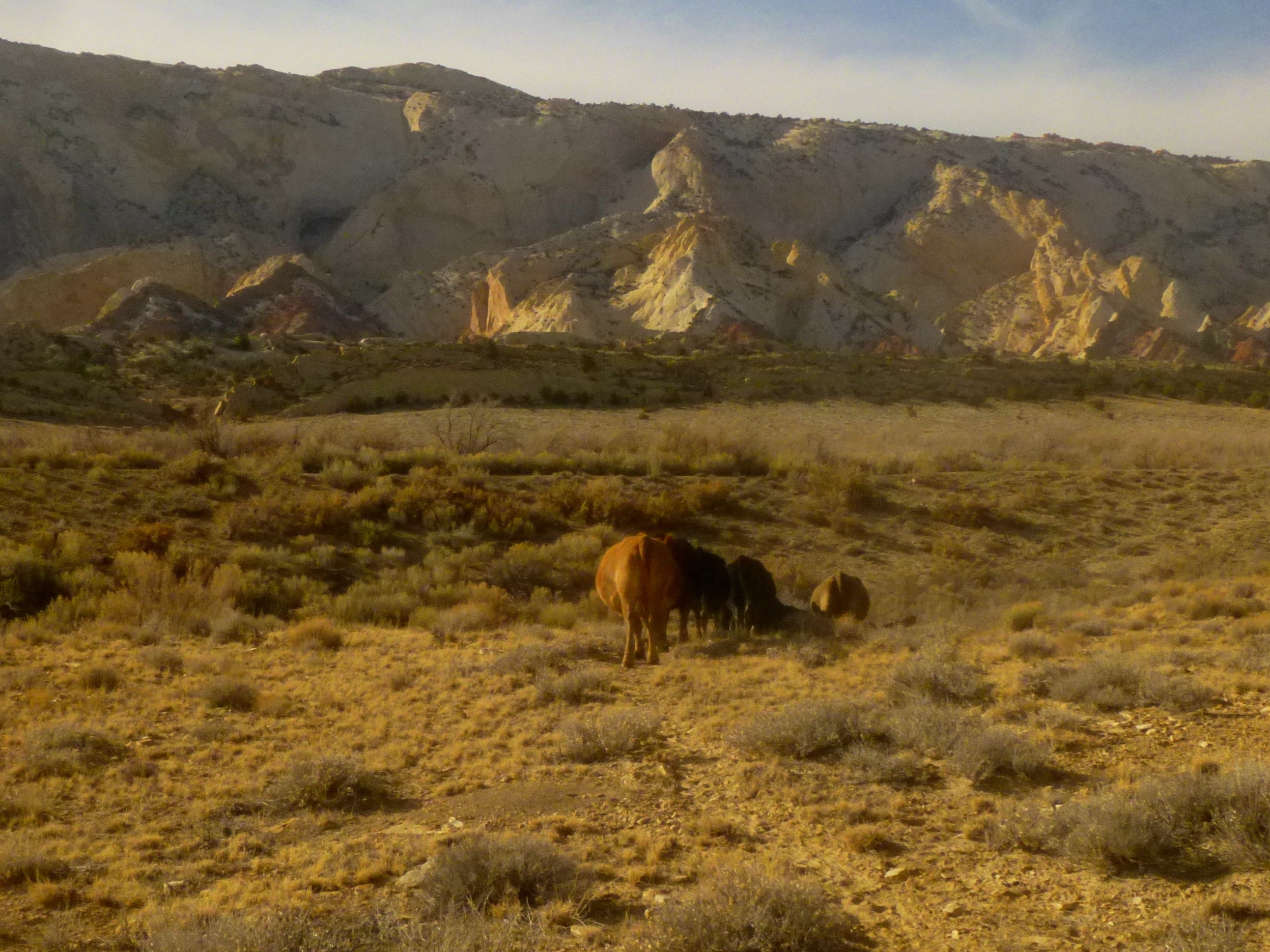 The route into Bitter Spring Creek Canyon is one of those if-you-have-done-everything-else hikes, buried in an isolated corner of Capitol Reef National Park. Yet the geology-minded will be rewarded with up-close views of the eroding layers of Mancos shale, while biologists will discover small groves of cottonwoods and perhaps a few canyon-dwelling creatures. In the winter or spring, as the canyon falls within a designated grazing allotment, you’re likely to have company—herds of cows can be found commuting between water sources, including the creek itself and Little Lake Mead. This report describes a roughly 2.2-2.5-mile hike to the Capitol Reef NP boundary, though the left fork of Bitter Spring Creek can be followed for at least an additional mile.