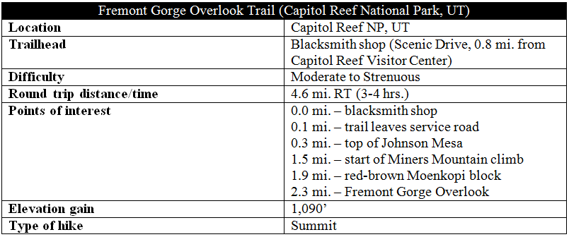 The 2.3-mile hike (one-way) to Fremont Gorge Overlook begins 0.8 miles down the Scenic Drive from Capitol Reef Visitor Center. Park at the historic Fruita blacksmith shop (if coming from the Visitor Center, it will be on the right), which sits at the base of gray-green Johnson Mesa. The first 1/10 mile of the trail climbs up a wide, dusty service road; just after rounding a bend, the trail leaves the road at a sign indicating “FREMONT GORGE VIEWPOINT 1.8.” (Note: This distance is incorrect; it is closer to 2.1-2.2 miles to the overlook from this point.)