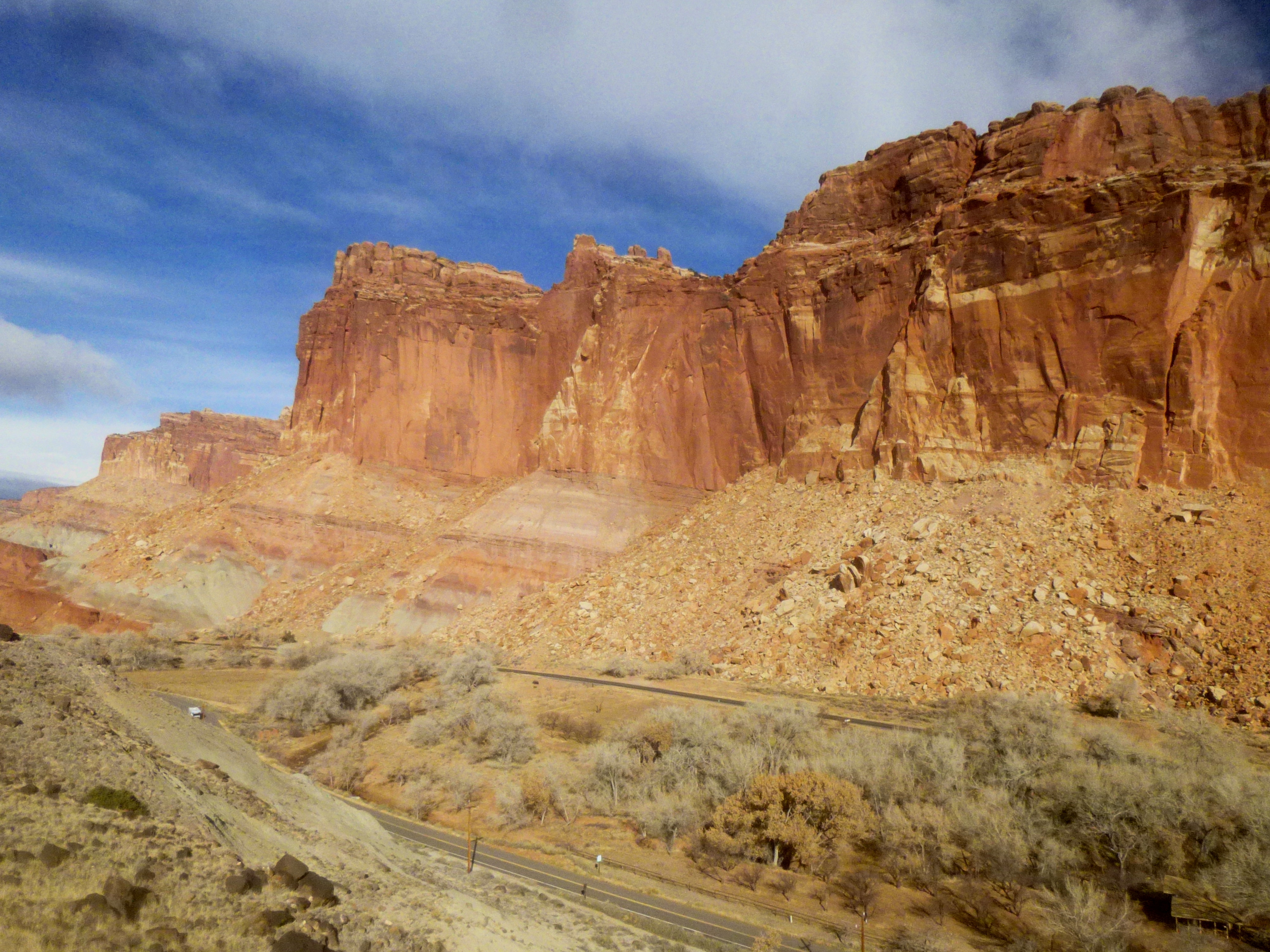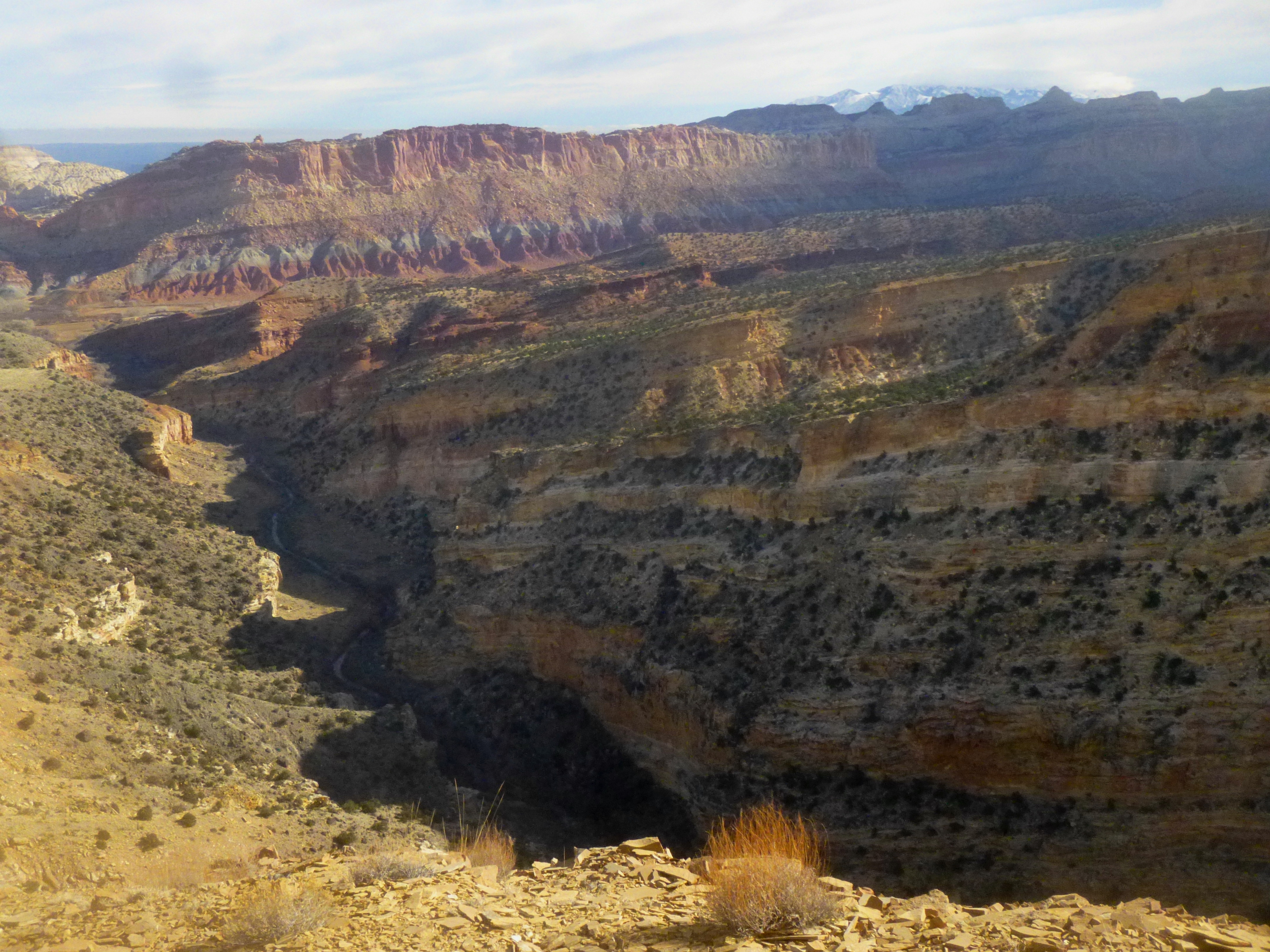 The view 800 feet down into the gorge from the overlook is remarkable. Fremont River snakes its way through the lower rock layer of White Rim Sandstone, leaving behind sheer cliffs and brown-tinted ledges that glimmer in the morning sun. Verdant Boulder Mountain (the source of all those black boulders on Miners Mountain) is framed by the canyon rims to the east, and exposed diagonal streaks of yellow limestone color the southern walls. Here you are observing the two old oldest rock layers in the park, dating to the latter half of the Paleozoic era (541-252 million years ago).