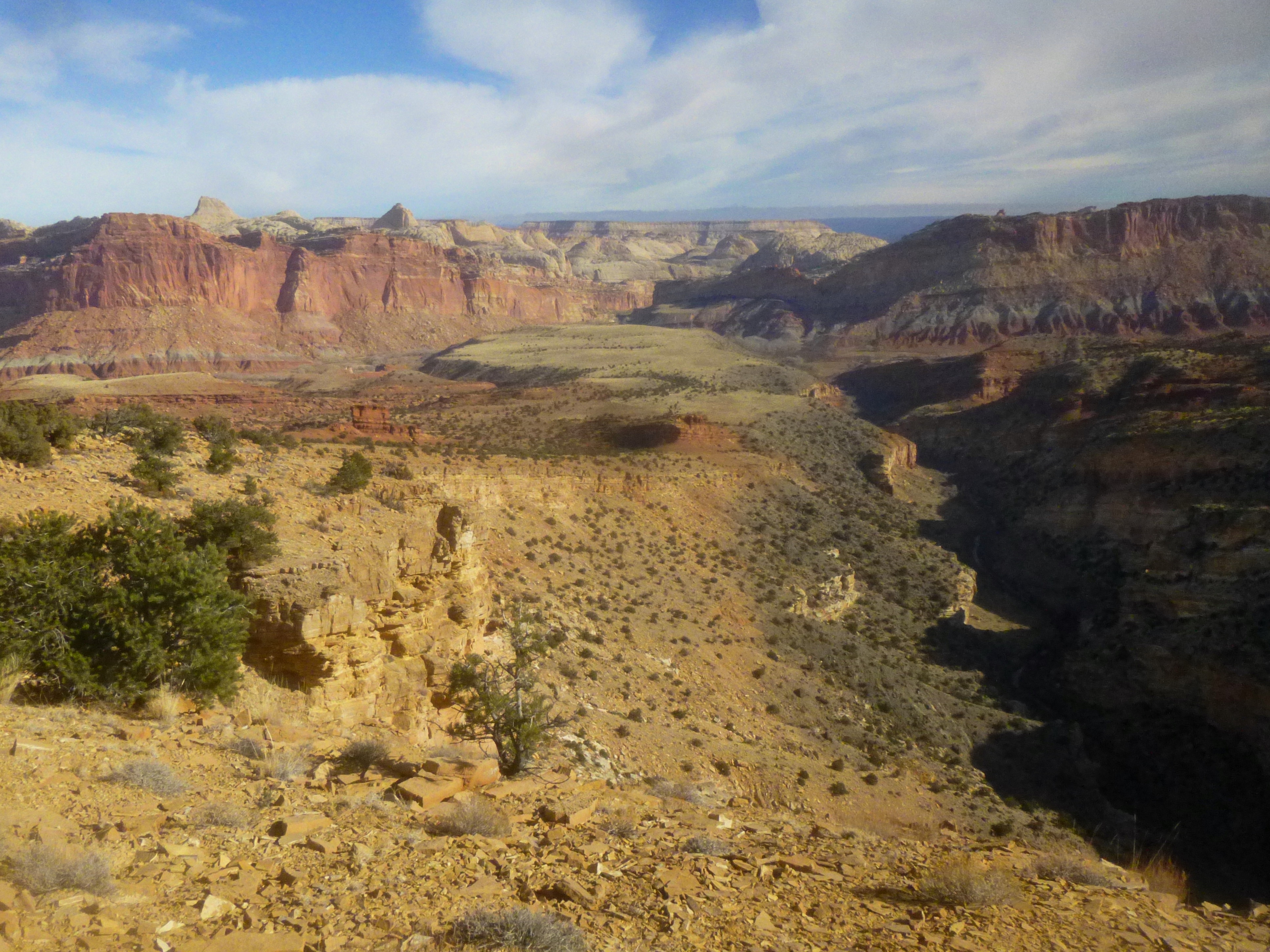 It’s hard to choose a favorite among the multitude of fantastic hikes in Capitol Reef National Park, especially as there are a handful of front-country and backcountry trails I have yet to explore. Yet the subjective leader to date may be the stunning Fremont Gorge Overlook Trail, an underrated and oft-forgotten 4.6-mile out-and-back beginning just down the road from the Visitor Center. The route gains 1,090 feet in 2.3 miles, but the ascent is broken up by a flat, pleasant jaunt across the length of Johnson Mesa, littered with junipers, Mormon tea, and Capitol Reef’s famous “black boulders.” The panorama from windy Fremont Gorge Overlook offers both a terrific view of the gorge and a splendid vantage point of the park’s precipitous, multicolor cliffs—making the arduous climb worth every step. Note: For the best views of Fremont Gorge, hike early in the morning to avoid dark shadows; for the rest of the panorama, hike in the afternoon. Arriving at the overlook around noon or 1 p.m. offers a fine look of both.