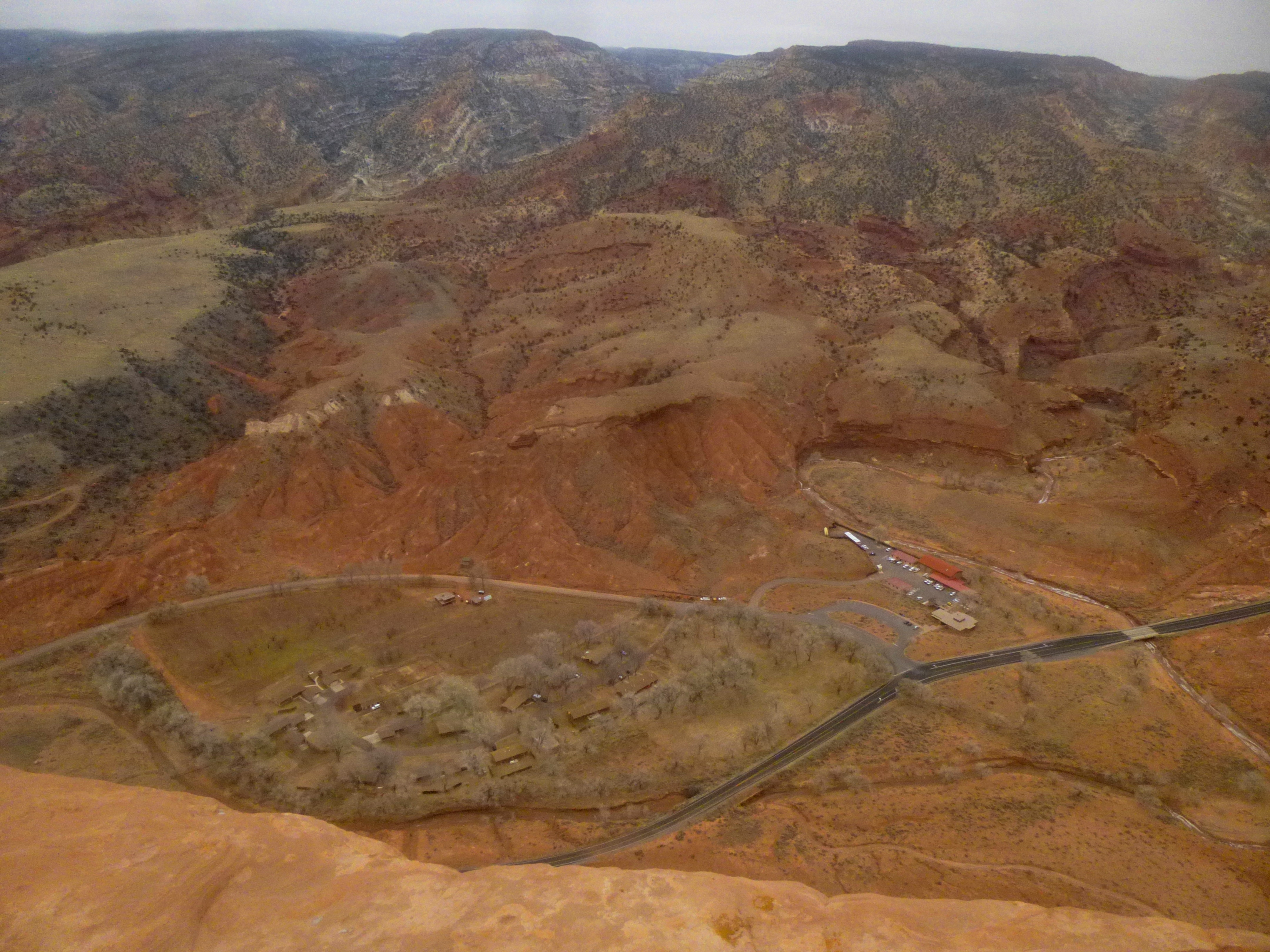 Looking due west, it’s easy to spot the Visitor Center and red-roofed Park Headquarters, as well as Sulphur Creek Canyon. Highway 24 weaves west out of sight—but you’ll see more of it from atop Navajo Knobs, 2.5 miles farther.