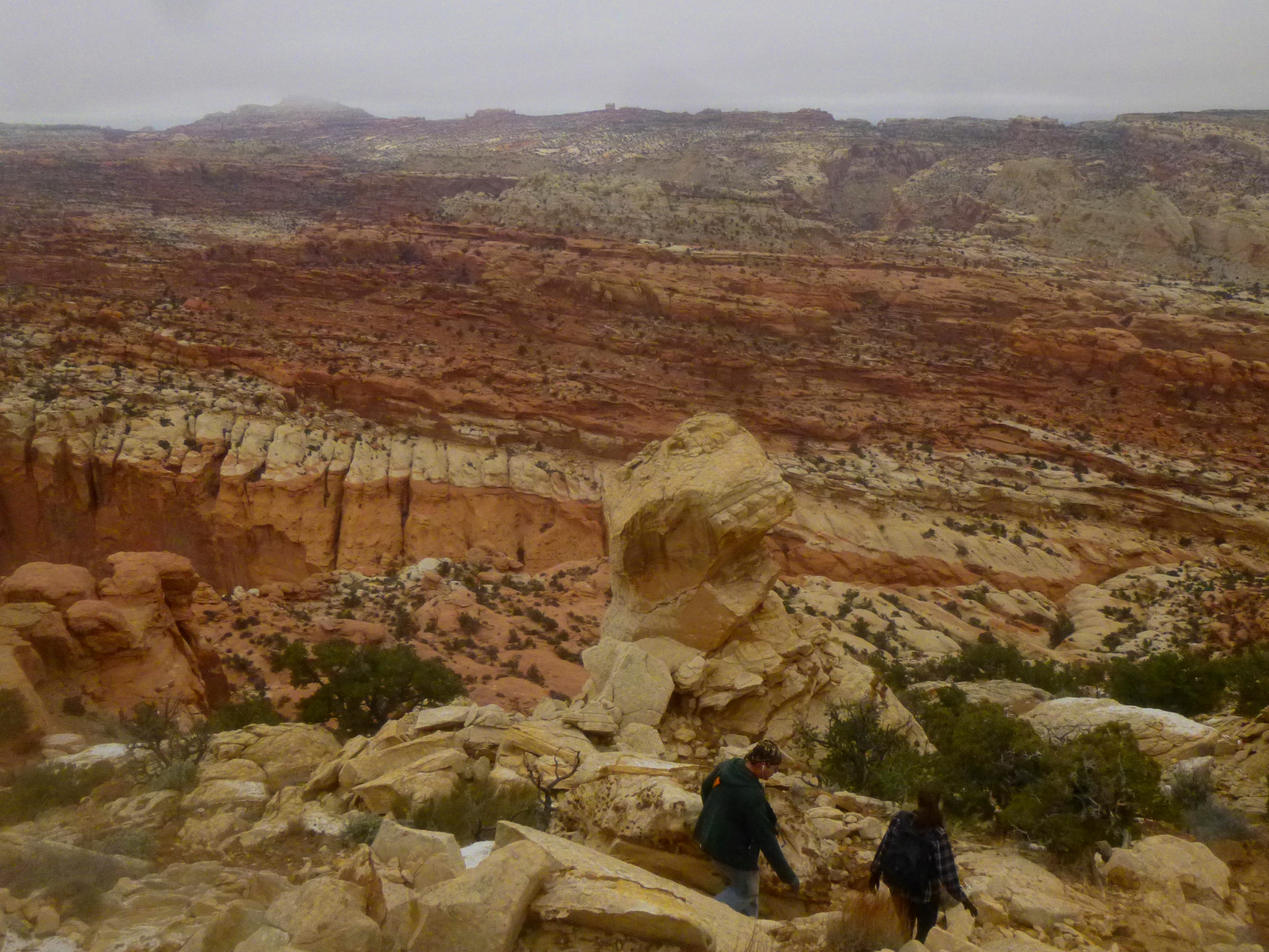The upward-slanting Kayenta shelf at Rim Overlook offers sweeping views of the Fruita Historical District below, including a multitude of fruit and nut orchards, the historic schoolhouse, the Gifford barn, the shady campground, and the first few miles of the Scenic Drive. It is hard to miss the 22 switchbacks leading up to Cohab Canyon (a great hike of its own), as well as six jagged slots known to canyoneers as “The Wives.” Beyond Cohab, it’s more Kayenta, then the higher Navajo sandstone. The humorously-named Fern’s Nipple (7,085’) can be seen on clear days, as can the Henry Mountains.