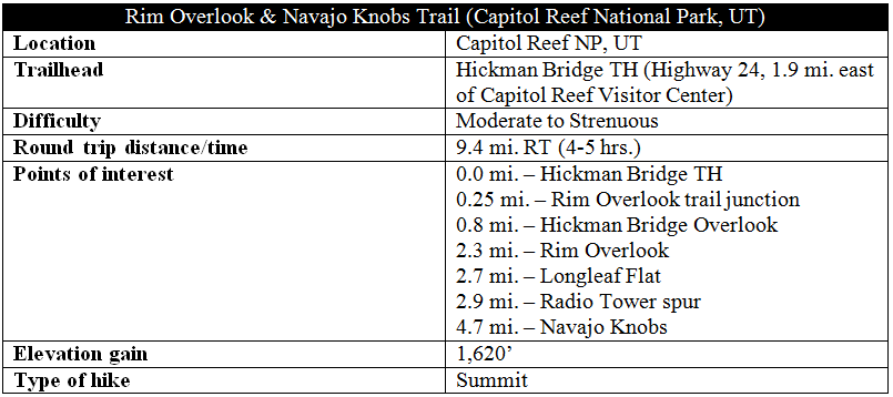 This classic Capitol Reef hike to Rim Overlook and Navajo Knobs begins and ends at the Hickman Bridge Trailhead (~5,400’), found adjacent to the Fremont River 1.9 miles east of the Capitol Reef National Park Visitor Center. There are pit toilets and an interpretive sign at the trailhead; the majority of other visitors you might encounter in the parking area are likely heading to Hickman Bridge, a popular 1-1 ½ out-and-back hike to a picturesque natural bridge. Don’t worry—you’ll only be sharing the trail with these folks for about ¼ mile.