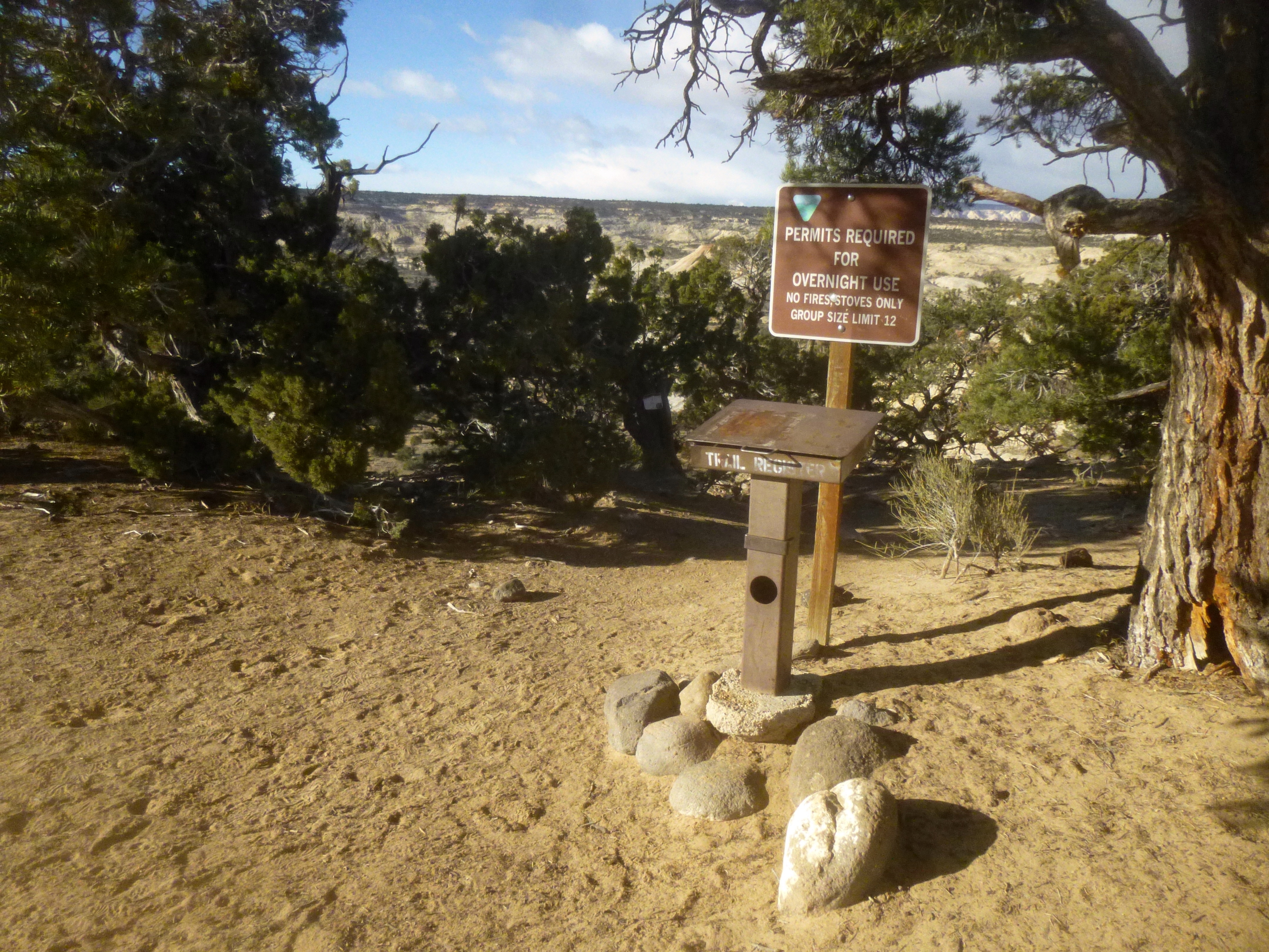 Weather permitting, the dirt track leading 0.1 mile to the trailhead should be passable to low-clearance, 2WD vehicles, and there is plenty of parking available at the end. In the shadow of a ponderosa pine to the west, look for a brown BLM sign (“PERMITS REQUIRED FOR OVERNIGHT USE”) and a metal trail register, about 40-50 feet from the sandy trailhead. This is the start of your hike, and the last truly flat section until the canyon bottom.