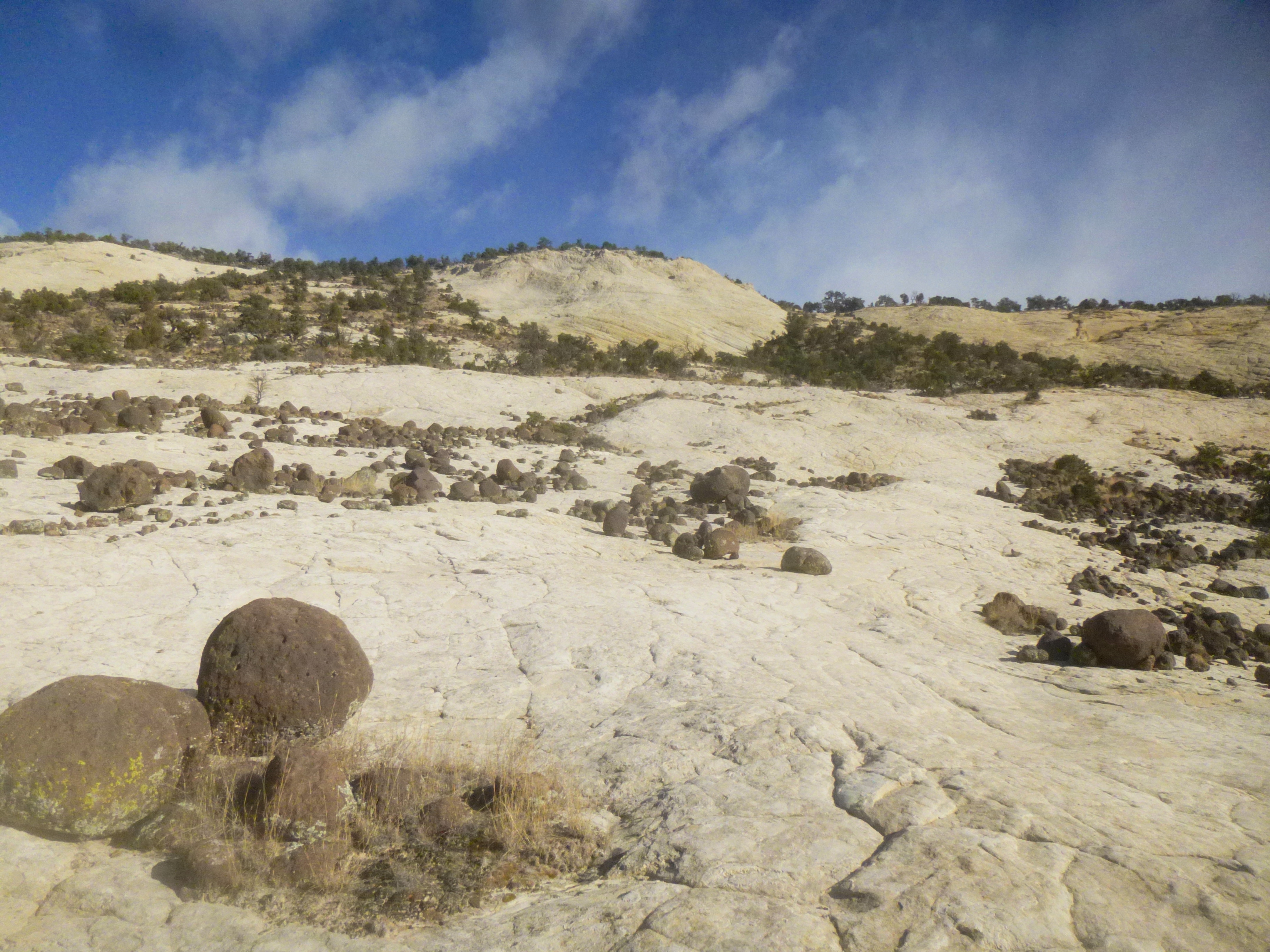 The obvious path below serves as a reference point as you begin your first steep descent across pearly white slickrock. Though the trail is poorly cairned, the high-grade route is intentionally bounded on both sides in many spots by rounded black boulders, making it relatively easy to follow. The path veers right toward a grove of pinyons, ponderosas, and junipers; eventually it weaves in and out of this grove. The white checkerboard incline is not as intimidating as it first looks: assuming the rock is not wet, hikers with decent boots should be able to find sufficient traction.