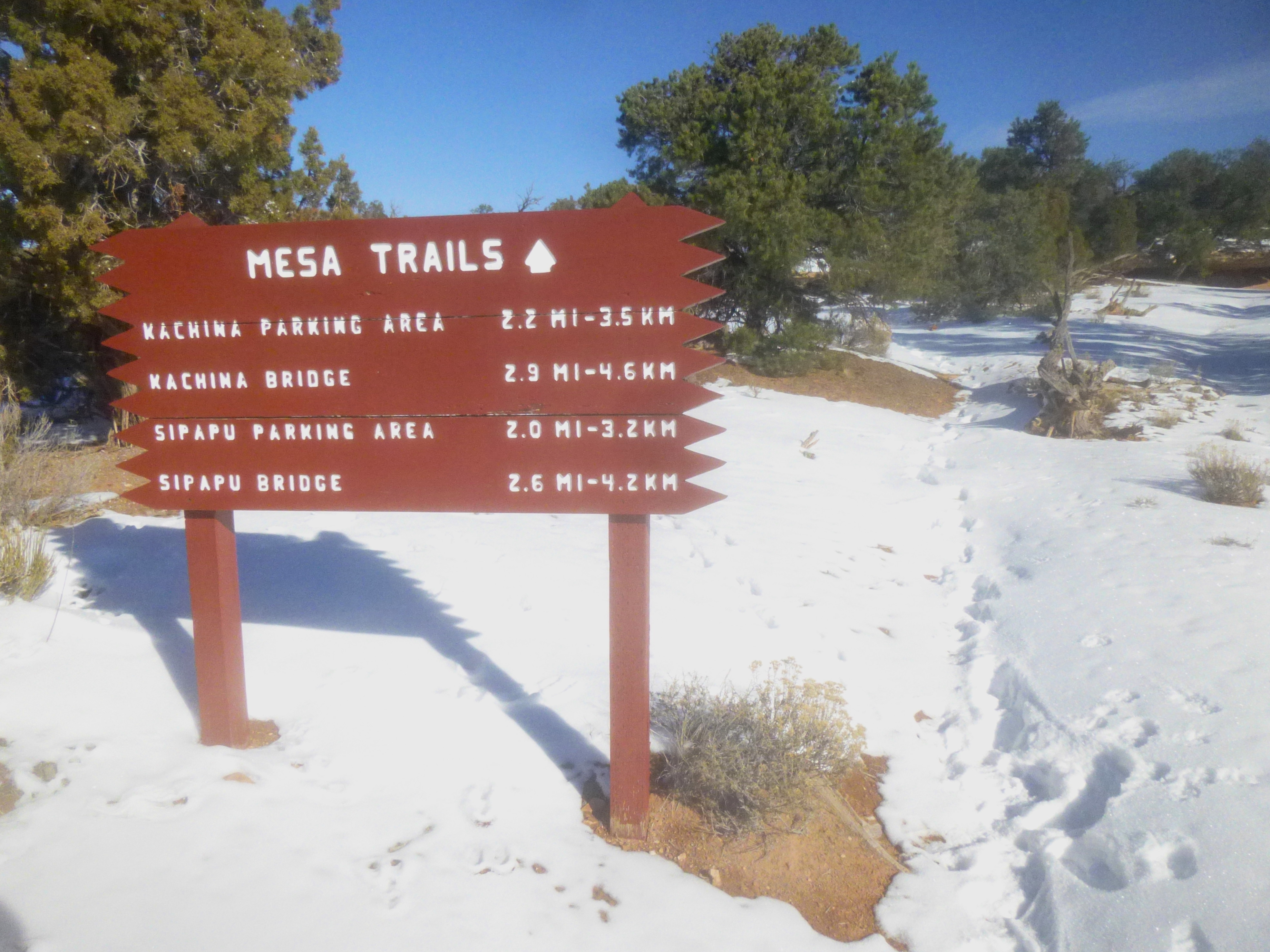 From the Owachomo Bridge parking area, cross the street to the north end, where a large red sign indicates the start of the “Mesa Trails” system. It is two miles across relatively level terrain from here to the Sipapu Bridge parking area.
