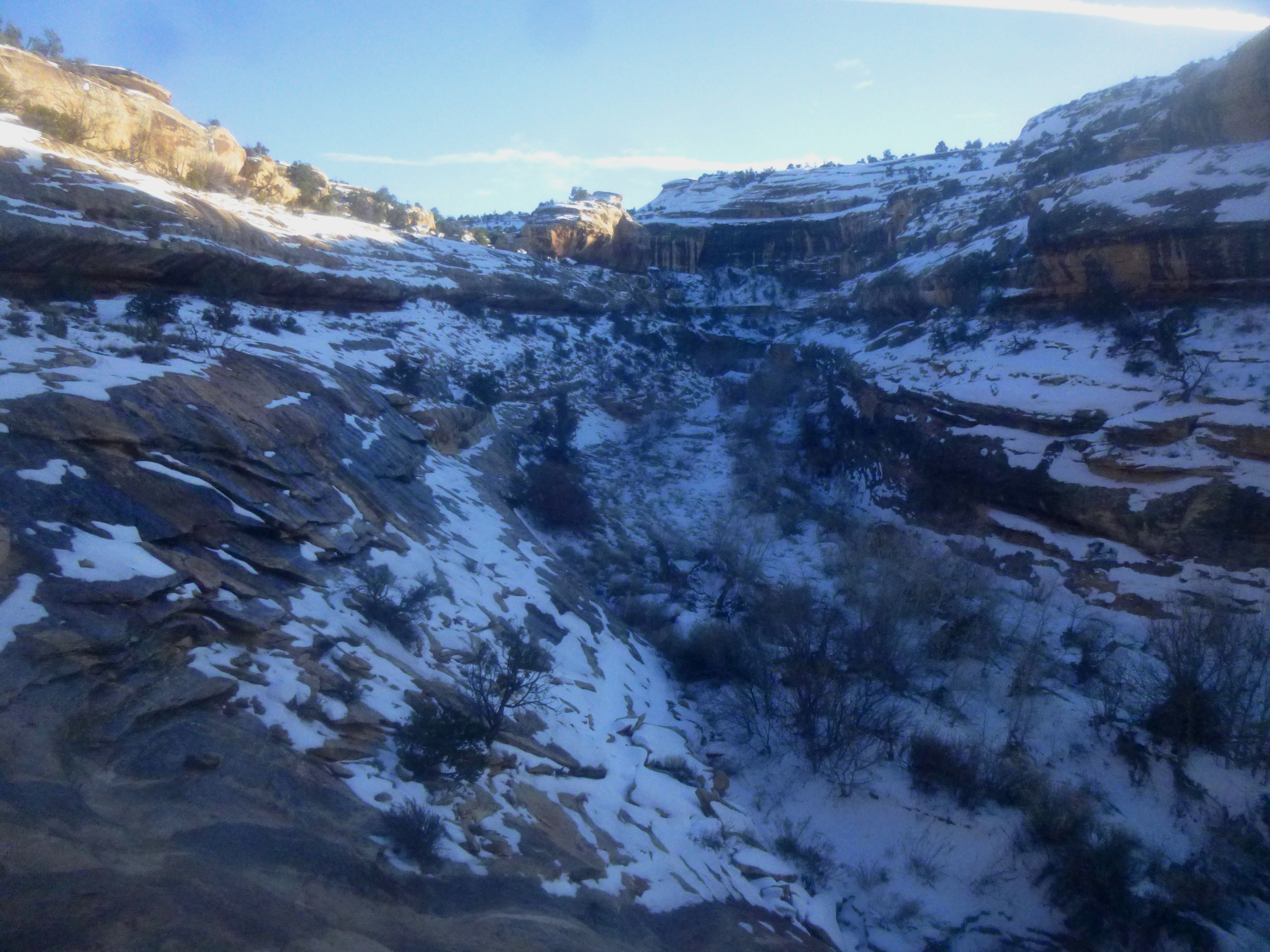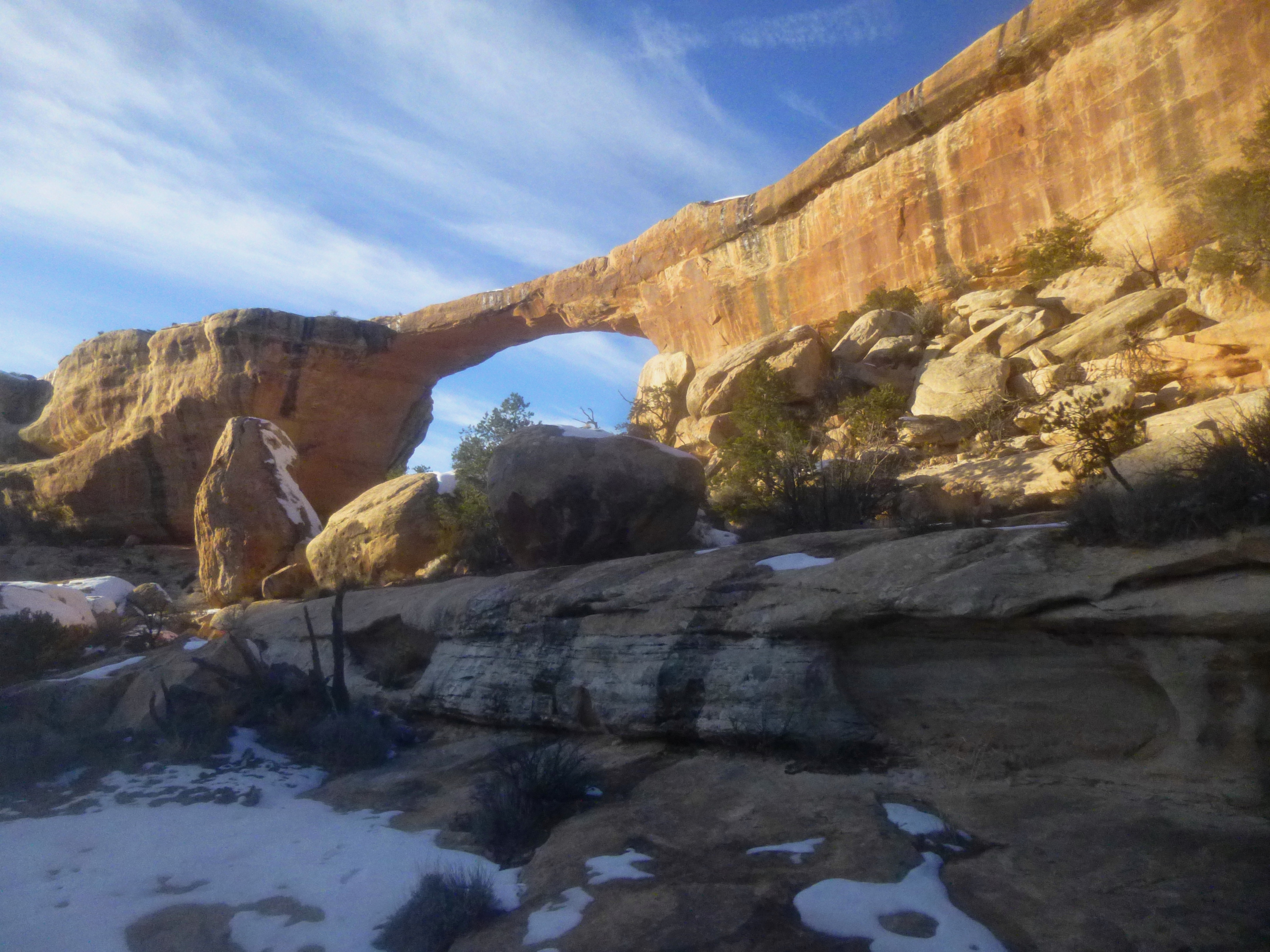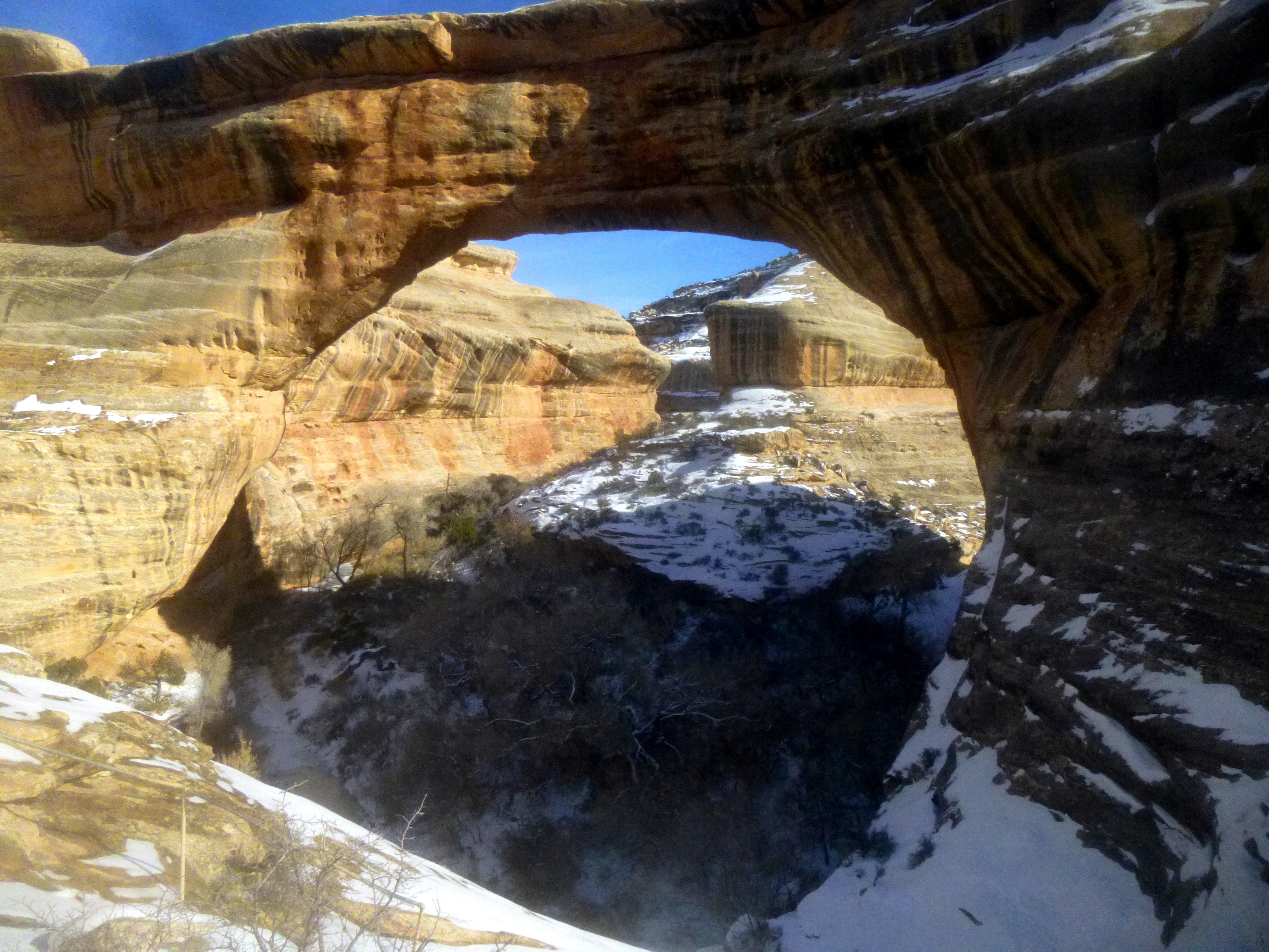 (Note: I completed the Natural Bridges Loop in early January, when there were roughly three inches of snow on the ground. Much of the hike—especially in White and Armstrong Canyons—required improvisation; following faint, snow-covered trails and footprints of other hikers; and inventive, icy creek crossings. Therefore, the following route description may not be entirely accurate under different conditions.)