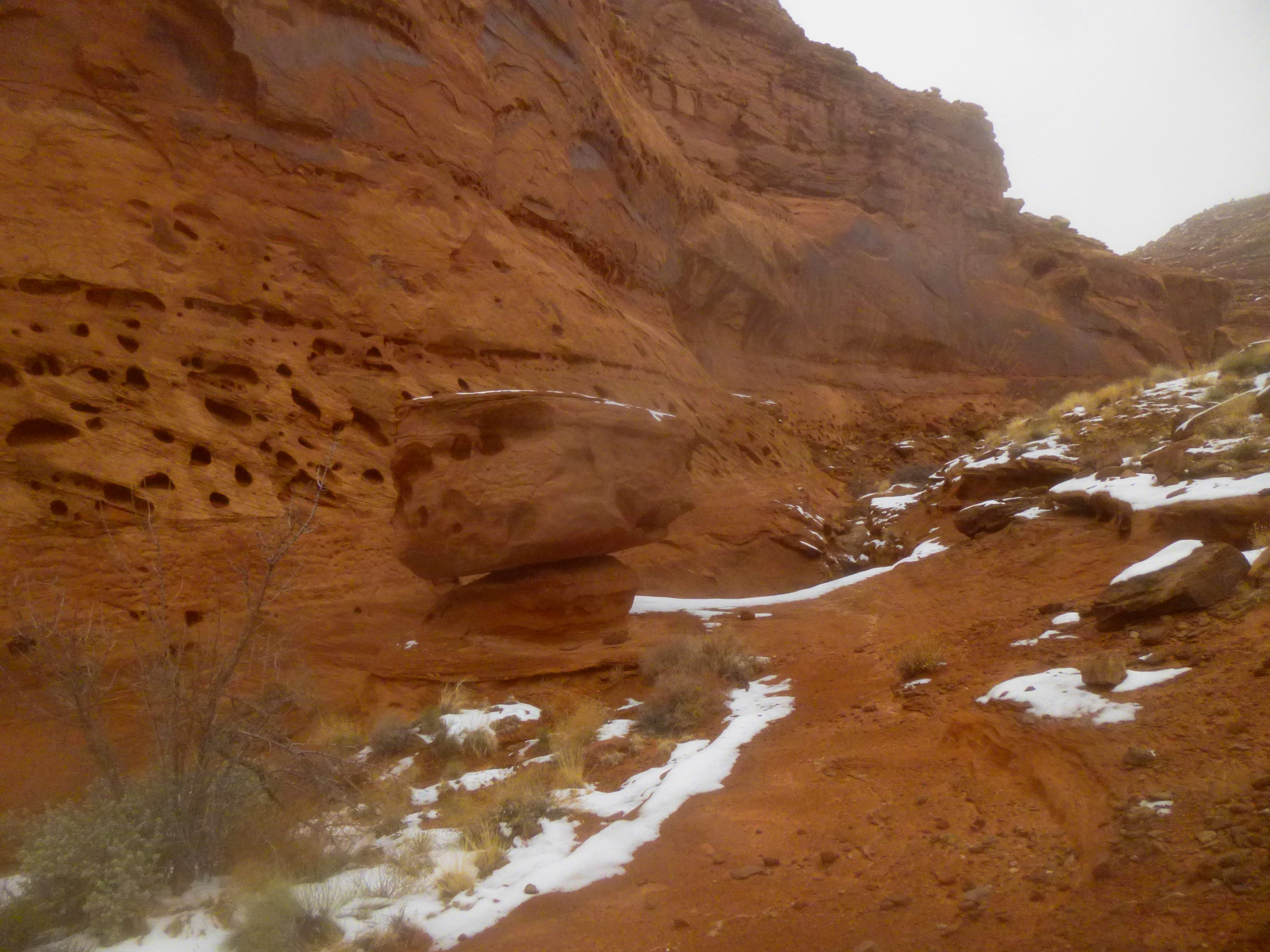 Precariously-placed rock, above the narrows on the  bench to the south, Stair Canyon