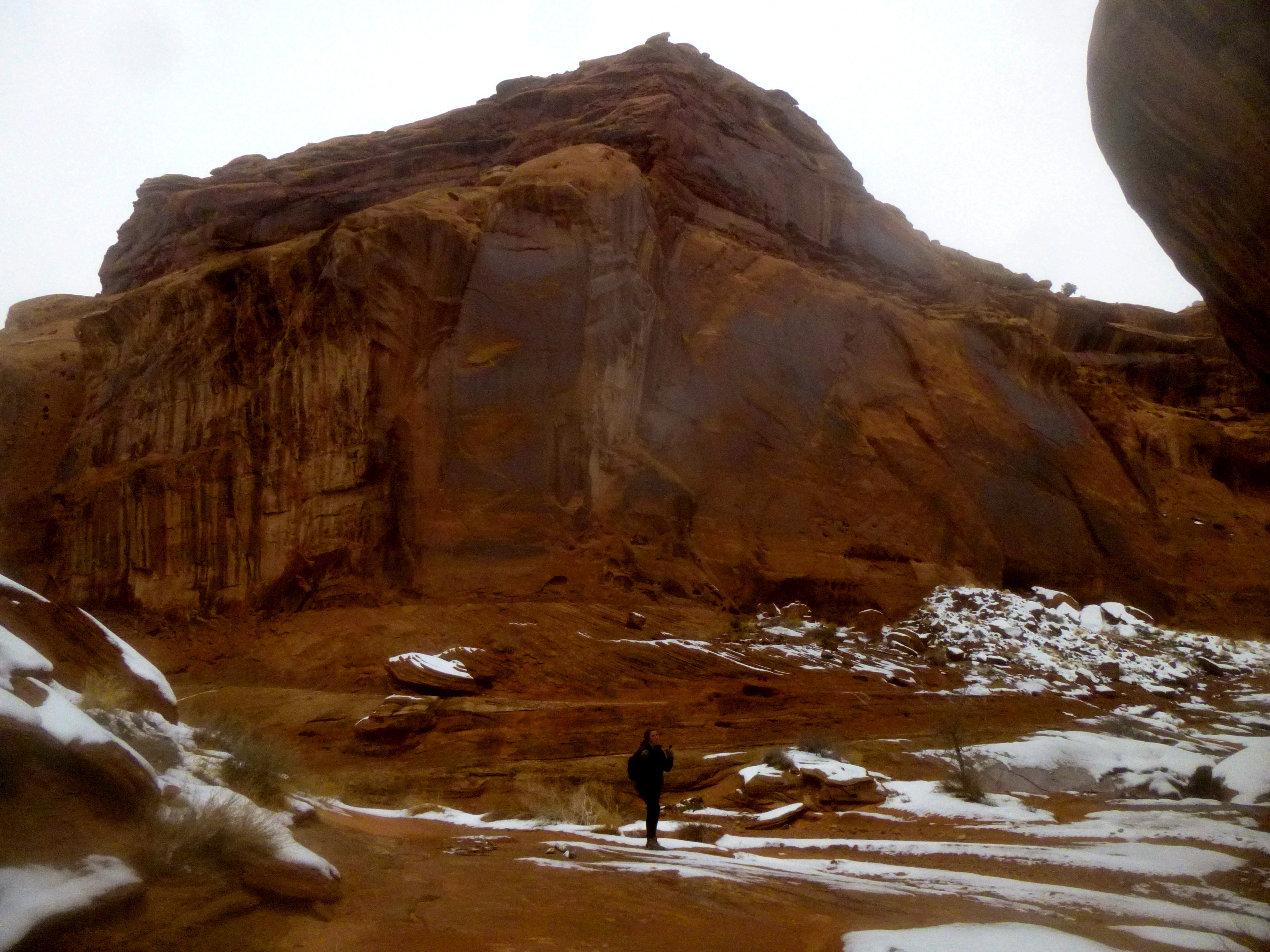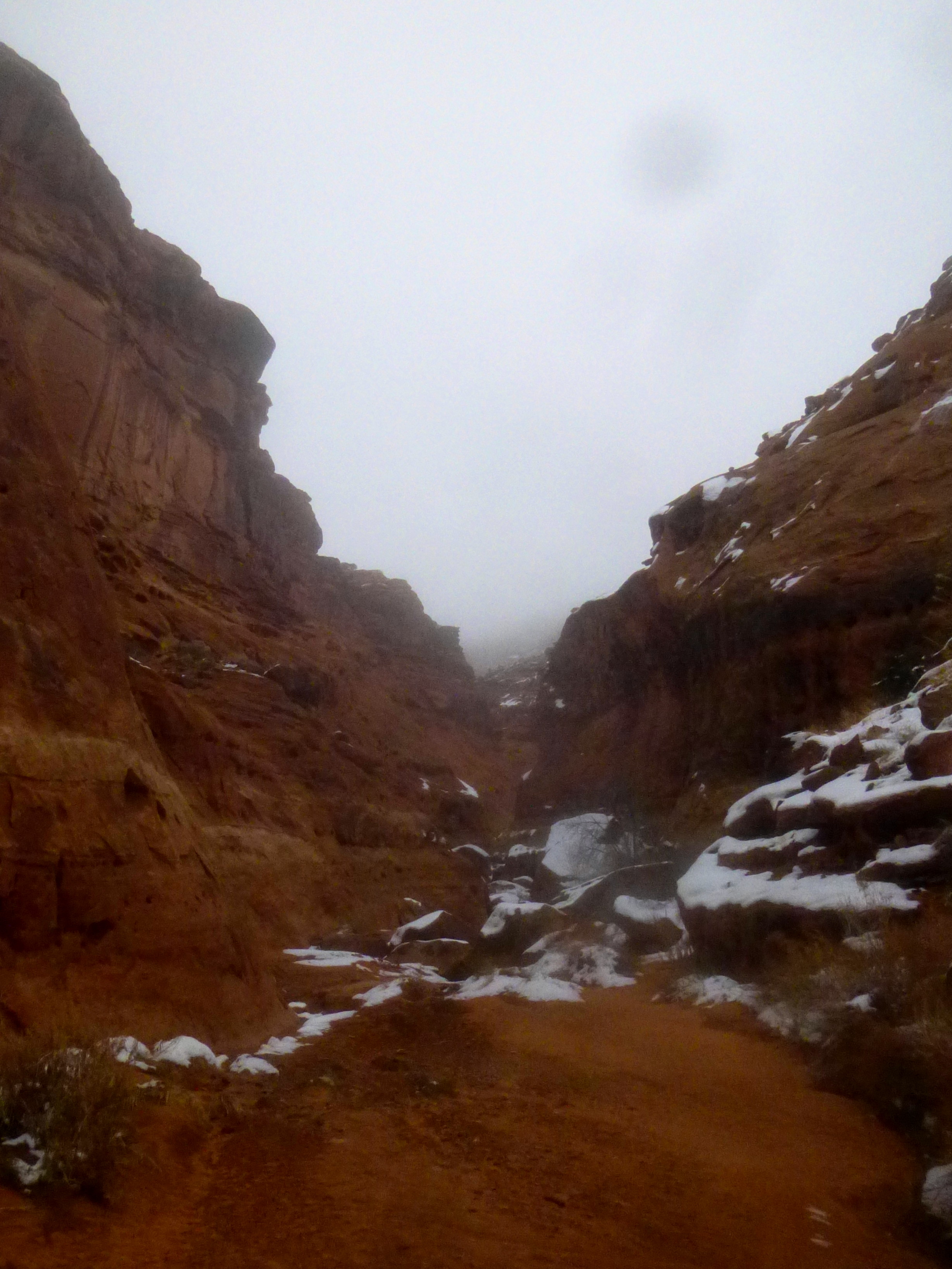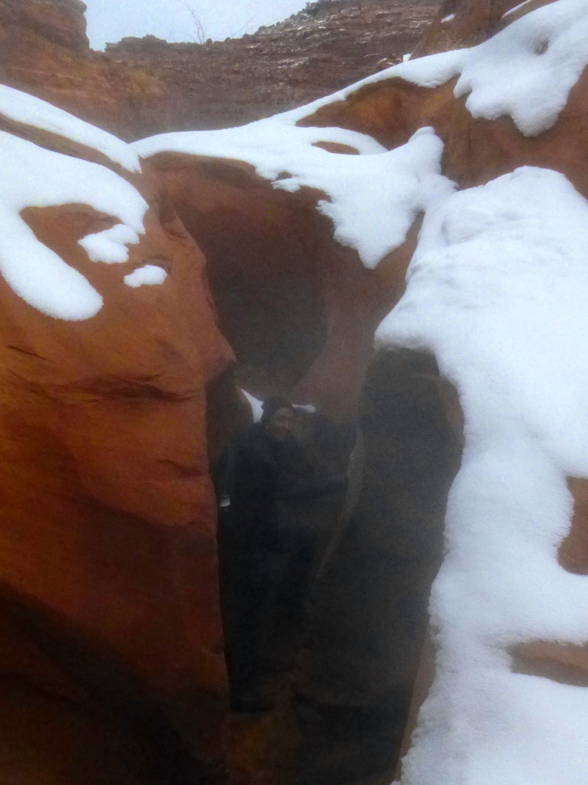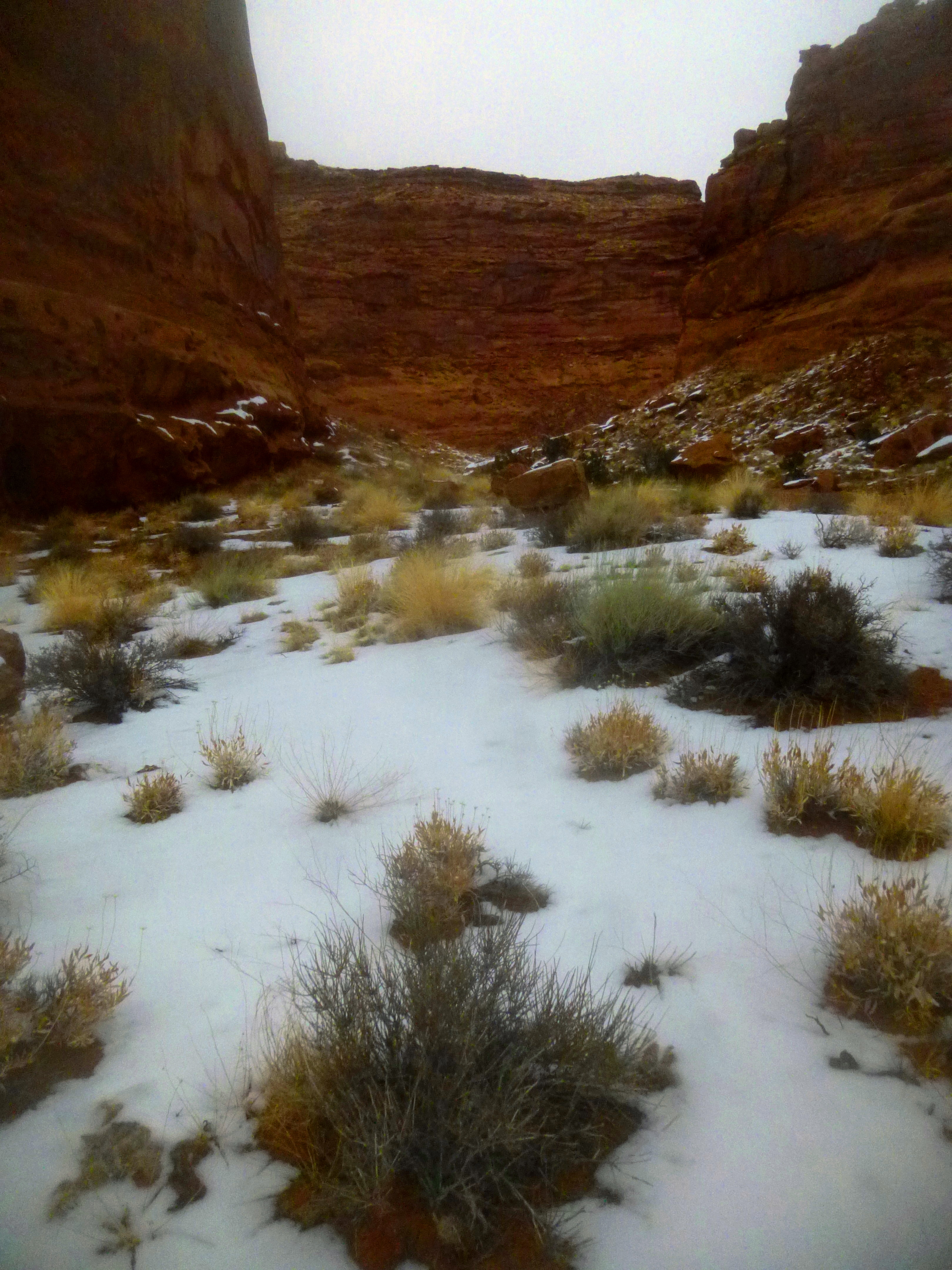 Both forks are worthy of exploration, though progress will quickly be halted for all but the most hearty climbers. According to Adkison’s book, the right fork leads within ¼ mile to a “shady amphitheater” that offers a pleasant endpoint for the hike. However, about 1/10 mile up-canyon, the way is blocked by a collection of gargantuan boulders. The adventurous can ascend a steep incline on the left to bypass the boulder jam, but the steeply-sloping slickrock is not recommended for the fainthearted. (In January 2015, the slippery snow made this bypass virtually impassable to all but the insane.)