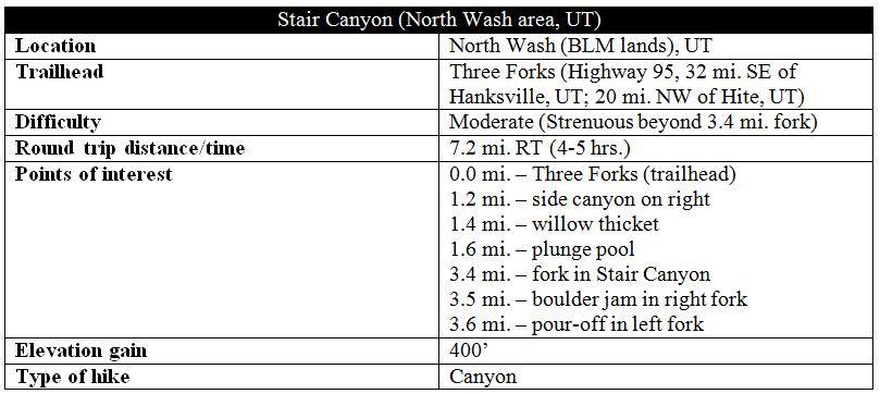 Stair Canyon is an isolated place in an already sparsely-visited area. The area known collectively as North Wash—between Hanksville, UT and the upper reaches of Lake Powell—is often frequented by the canyoneering types with their ropes and belays and fancy footwork, but there is very little advertised in the way of non-technical day hikes. This is not for lack of options: dozens of canyons feed into broad North Wash, begging to be explored. Ron Adkison’s Hiking Grand Staircase-Escalante & the Glen Canyon Region—the sole reliable resource I could find on day hikes in the area—lists four enticing trips up some of these tributaries: Butler, Stair, Hog, and Marinus. Among these, Adkison singles out Stair Canyon—rimmed by deep red, honeycombed cliffs and chock-full of willows, cottonwoods, and the occasional juniper—as North Wash’s “most interesting to explore.” It’s a rugged hike up-canyon—without a trail, the route simply follows the wash bottom—through occasional willow thickets, slots, and boulder jams, but the serenity and isolation of the confluence of Stair’s two upper forks offers an excellent destination for a day in an underappreciated section of southern Utah.