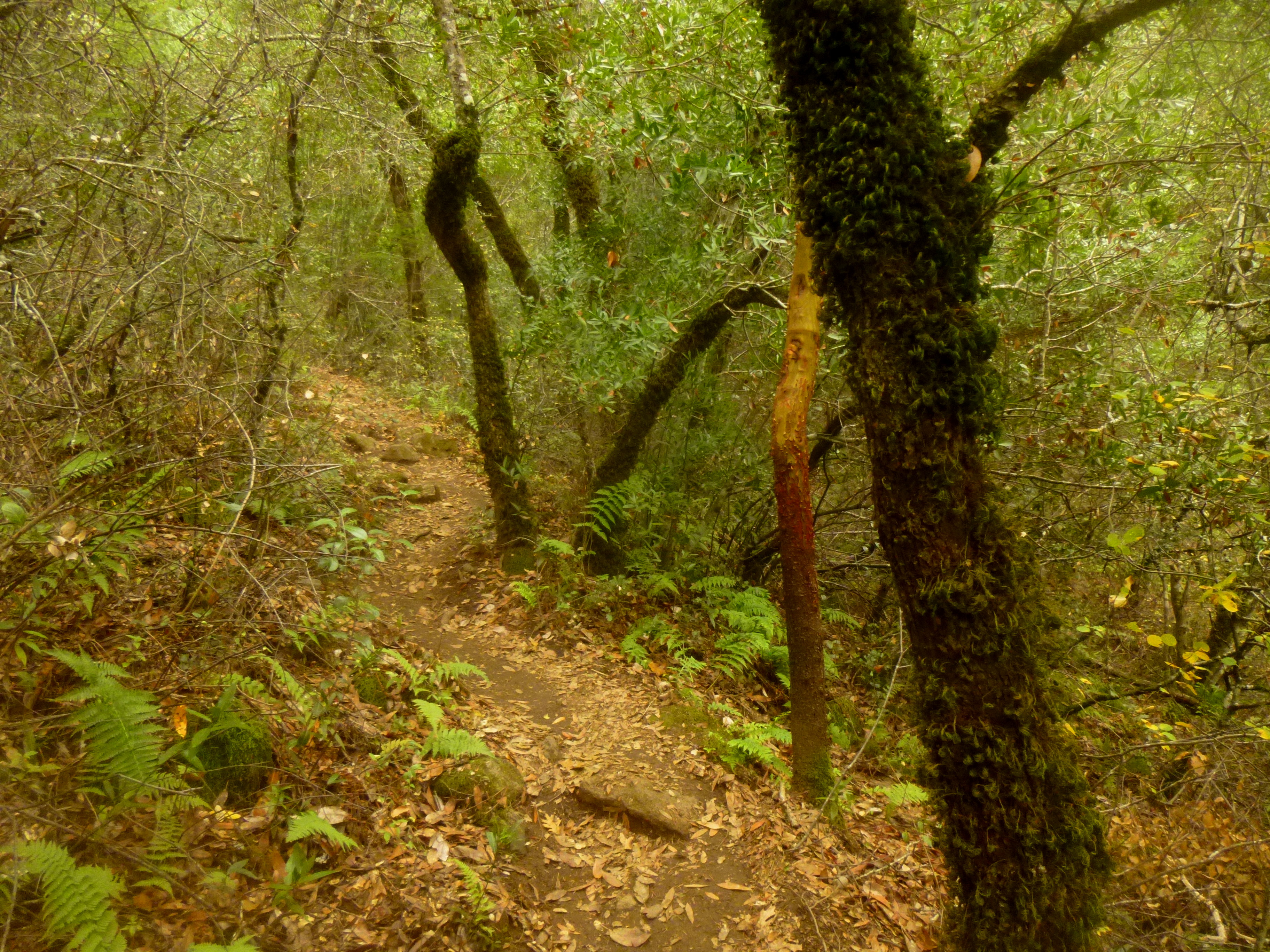 Leaving the scenic overlook behind, the trail again plunges into the trees, primarily pine, though oak and bay—as well as the wildly interesting madrone—are also present. As it approaches maturity, the strange yet beautiful bark of the madrone trees (arbutus menziesii) in this area reflects a dark red hue; branches give rise to bright green leaves and large red berries. Madrones periodically dot the trail, especially between the first and second overlooks.