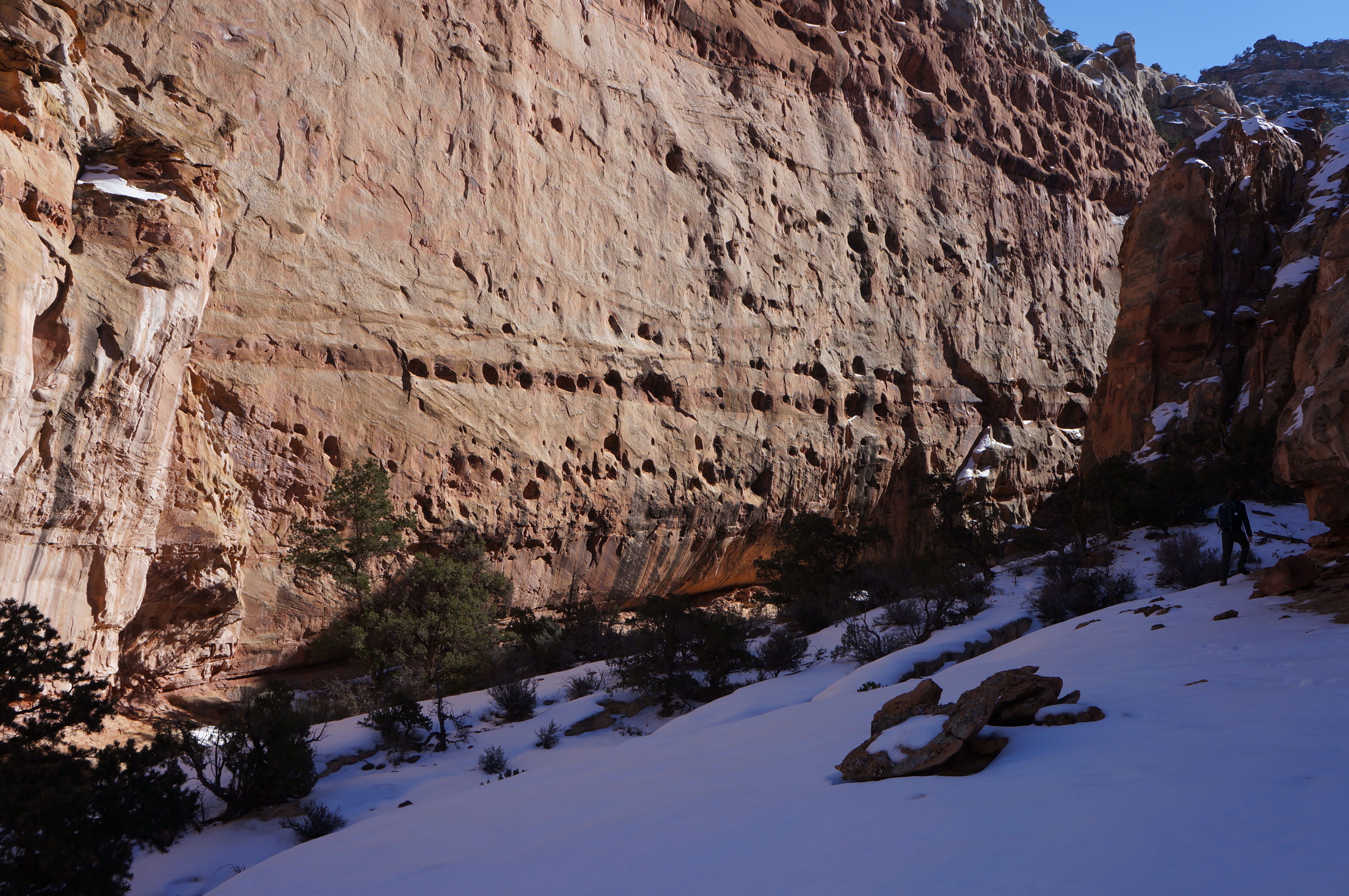 Hikers with tired legs and limited time should continue onward with the final 0.8 miles to Cohab Canyon. However, energetic explorers have a couple options for scenic side trips. The first is to walk 150 yards or so downstream to the right, where the wash bed drops off precipitously to a series of photogenic waterpockets below. This hidden spot is a nice spot to stop for a snack or lunch.