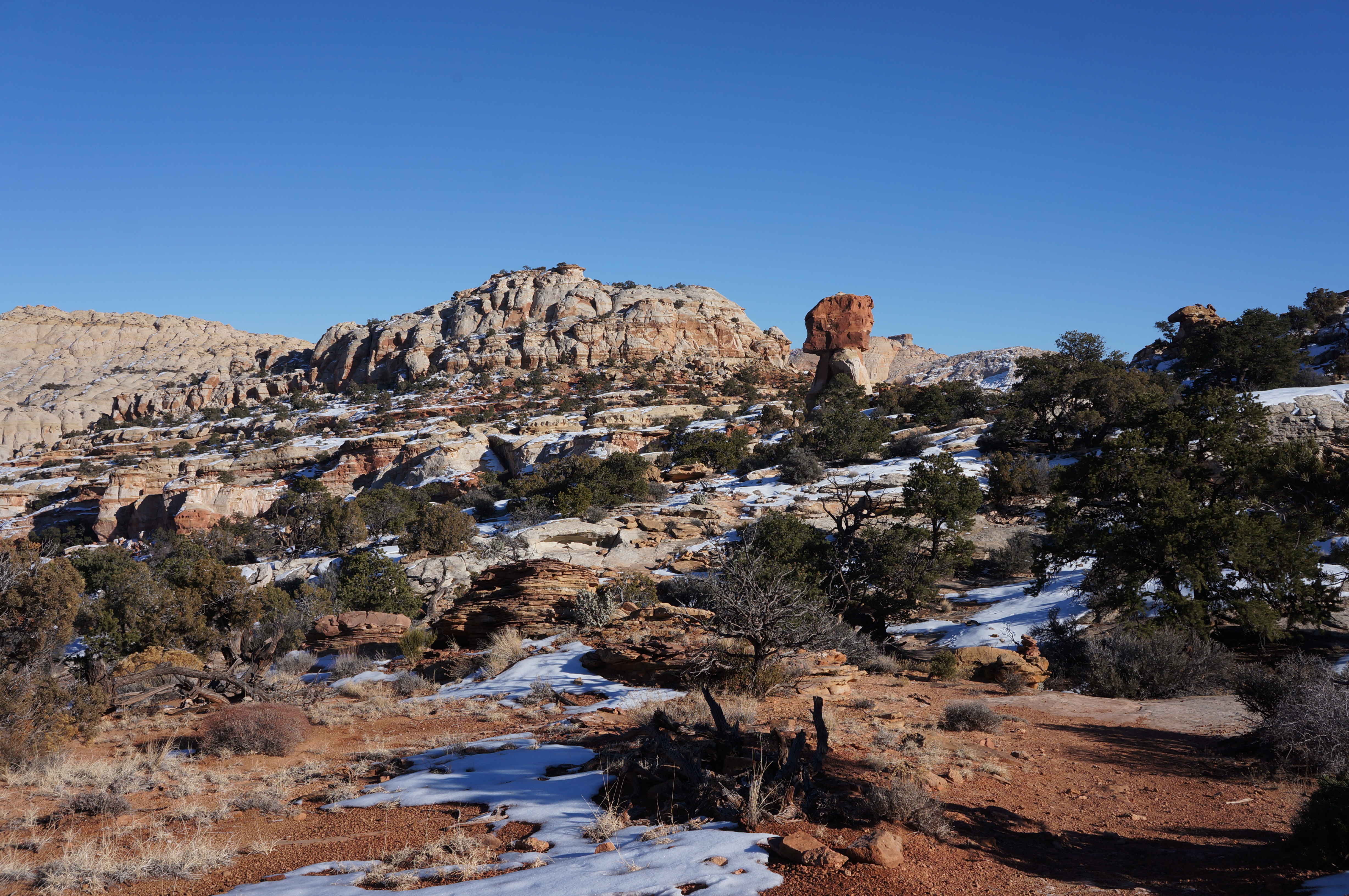 Just over a mile past the junction, the trail crests a ridge, revealing sweeping views in all direction. This is the hike’s highpoint (~6,450); climbable rocks on the left and right provide the best vantage point. To the north, a white band of Navajo domes stretches all the way to Horse Mesa (6,402’), a flattop capped by a different layer called Page sandstone. You can also see beyond these features to the higher elevations between Spring Canyon and Cathedral Valley beyond. To the northwest, views of Fruita are blocked in part by a rim of Kayenta in the foreground, but Boulder Mountain (11,317’) and Thousand Lakes Mountain (~11,300’) cannot be missed. Visibility off to the east on a clear day stretches as far as Factory Butte (6,321’), the Henry Mountains (11,522’), and even the La Sal Mountains (12,721’) near the Colorado border. Finally, the most prominent peak to the south is Ferns Nipple (7,065’), a peculiar-shaped landmark rising above Grand Wash.