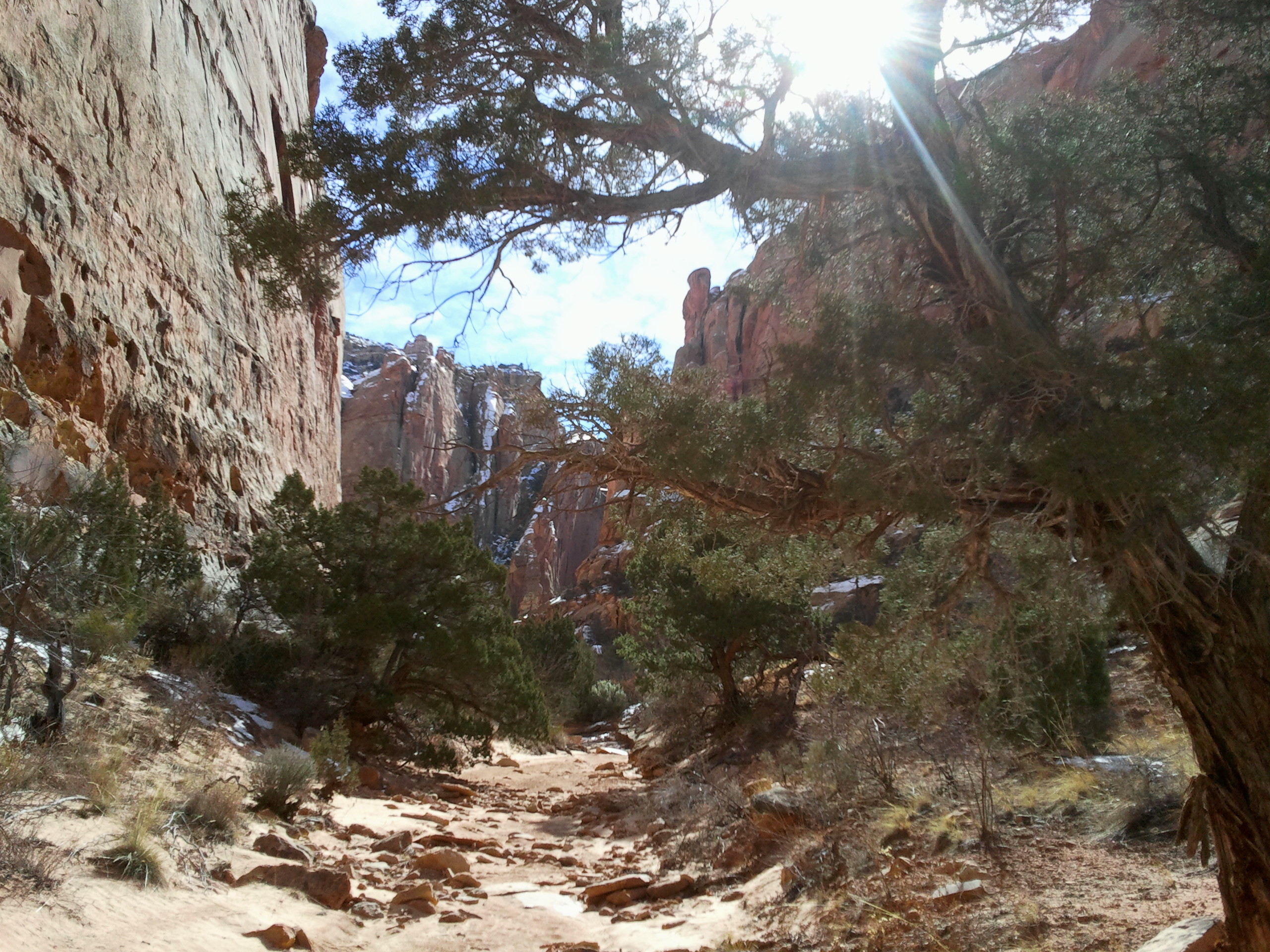 Continuing up canyon, a series of large boulder piles obstruct progress, forcing hikers to either attempt to climb over them or bypass the rock jams by ascending the talus slope to the left. There is a faint use trail (no cairns) amid Mormon tea and roundleaf buffaloberry leading up the slope, eventually topping out at the base of a tall sandstone cliff. Thin cracks in the wall suggest that this part of the canyon erodes in huge sheets: the remnants of past rock falls litter the slope and wash bottom below.