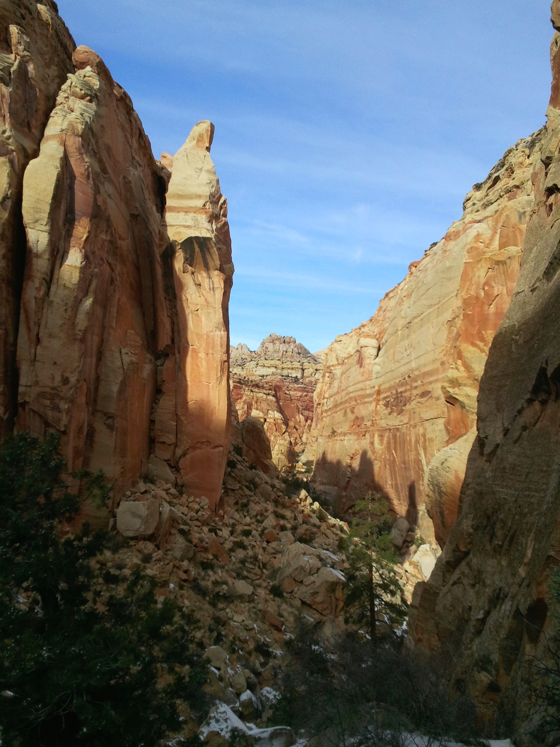 Unlabeled on most maps, rarely-visited Shinob Canyon in Capitol Reef National Park features towering monuments, truck-sized boulders, and at least three natural arches. The few visitors the gorge does receive are often technical canyoneers (they usually tackle the gorge’s Na-Gah, Timpie, or Nighthawk forks), but Shinob is a worthy destination even without ropes. There is no trail; the route simply runs through the wash bottom (where possible). Expect to spend roughly 1.5 hours round-trip if following the canyon to its end.