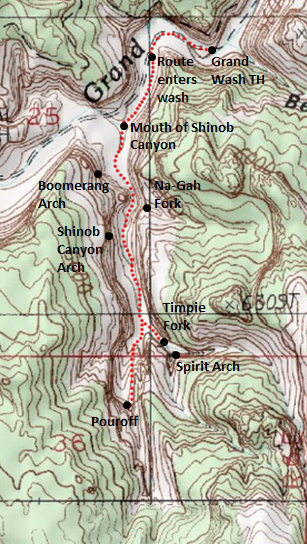 Though the dirt-packed Grand Wash Road passes right next to the entrance to Shinob Canyon, there is no real parking at this spot; continue another 0.3 mile to the road’s end and park at the Grand Wash Trailhead. (Note: This area is likely to be crowded during peak season.) Backtrack by following the road back west for about 150 yards, then walk south in the wide, dry wash bed for another 150. By now you will see Shinob Canyon straight ahead; leave Grand Wash by turning into the obvious dry wash on the left to enter the gorge.