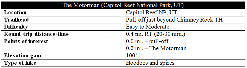 If coming from the east—the heart of Capitol Reef National Park—on Highway 24, park at the first pull-out on the left beyond Chimney Rock Trailhead. Here there is an interpretive wayside here directing attention to a fault line across the road to the north, but your journey to the The Motorman will take you south. You can spot the destination from the road.