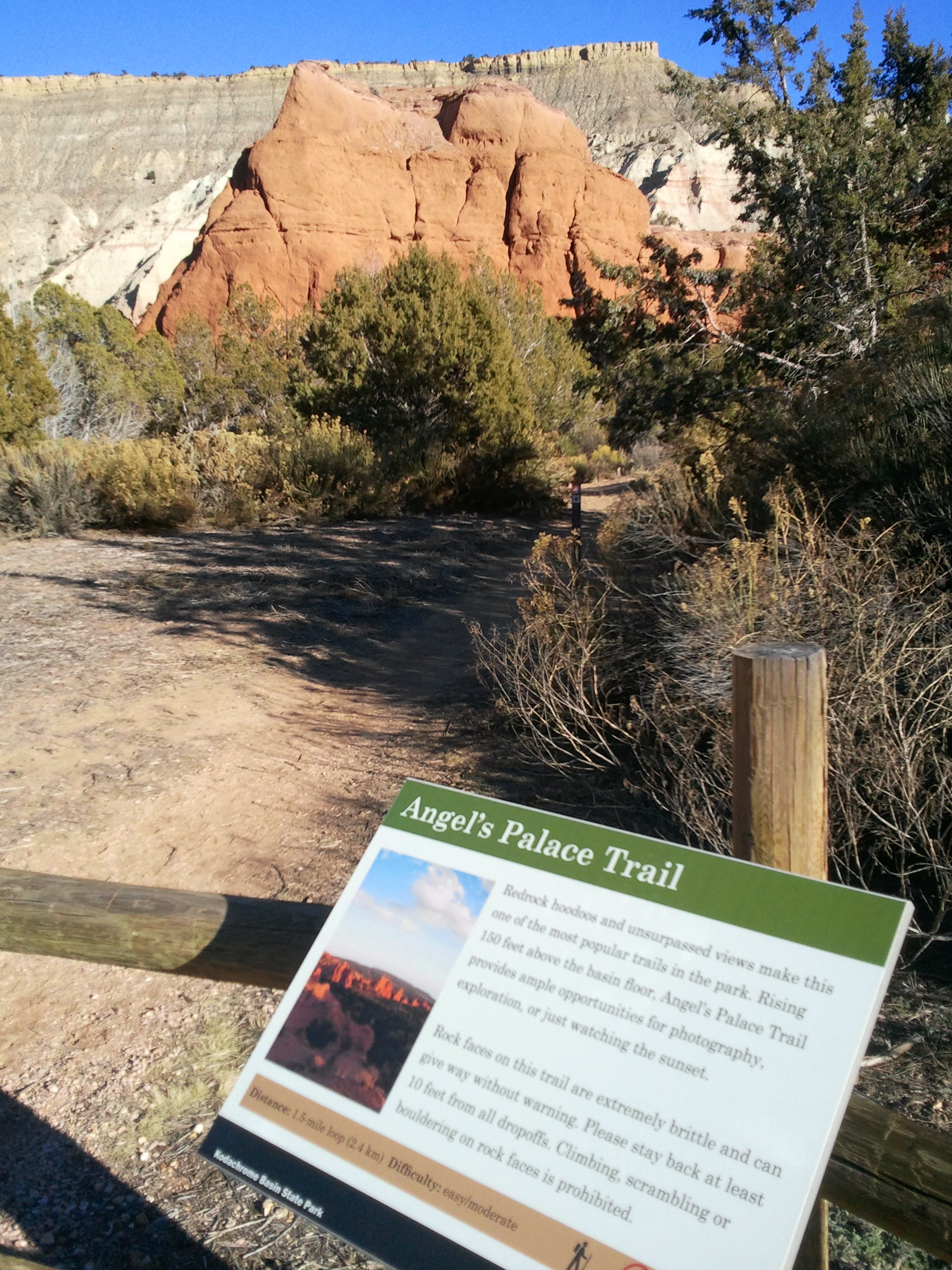 The Angel’s Palace hike begins and ends at the Nature/Angel’s Palace Trailhead, one mile north of the Kodachrome Basin Visitor Center. Park on the left-hand side of the road near the entrance to the shady Nature Trail, but cross the street to the east side to begin the Angel’s Palace Trail.