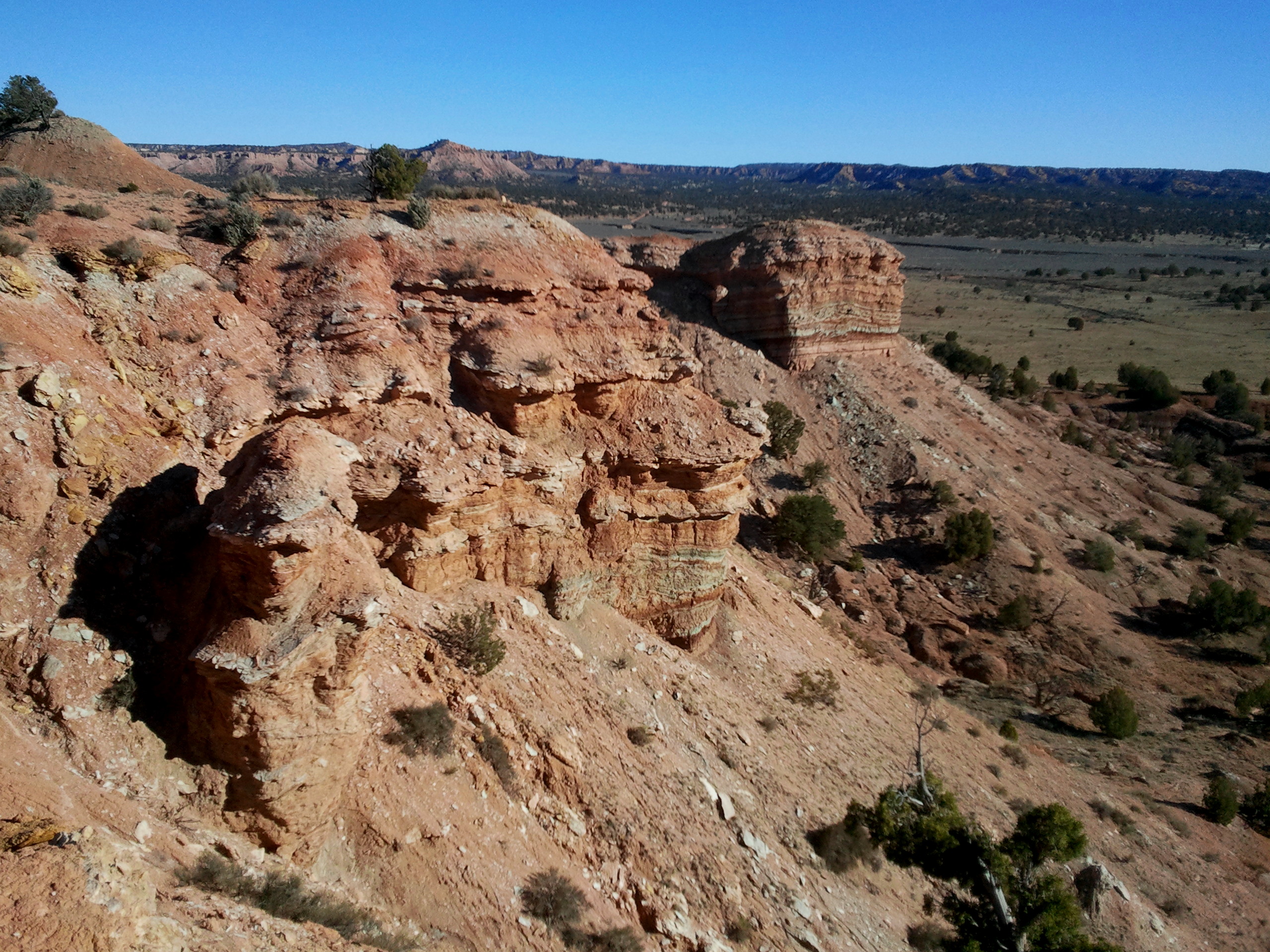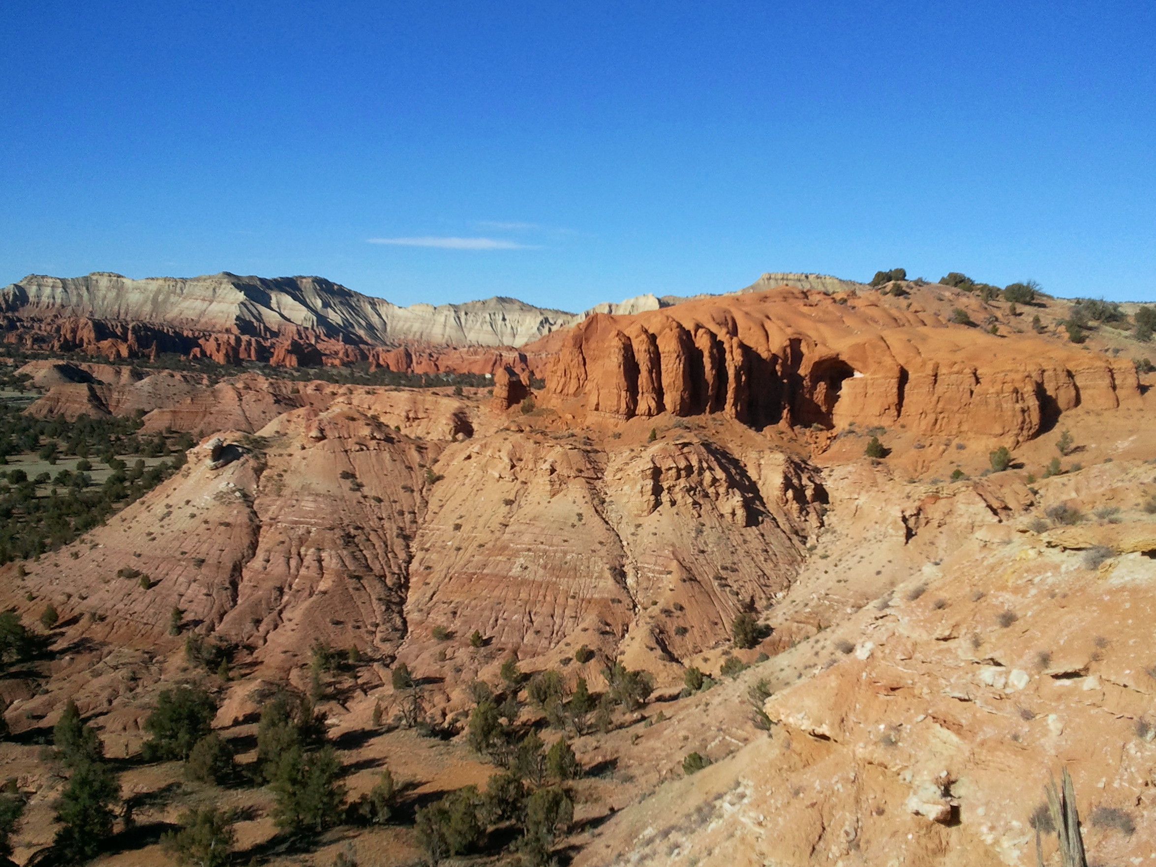 Upon returning to the main trail, one of the first things you’ll notice are the south-facing cliffs of the Carmel formation, composed of alternating layers of pink, gray, gold, and forest green. Speckling the landscape are also streaks of white: this is gypsum, a chalky mineral often used for drywall or fertilizer.