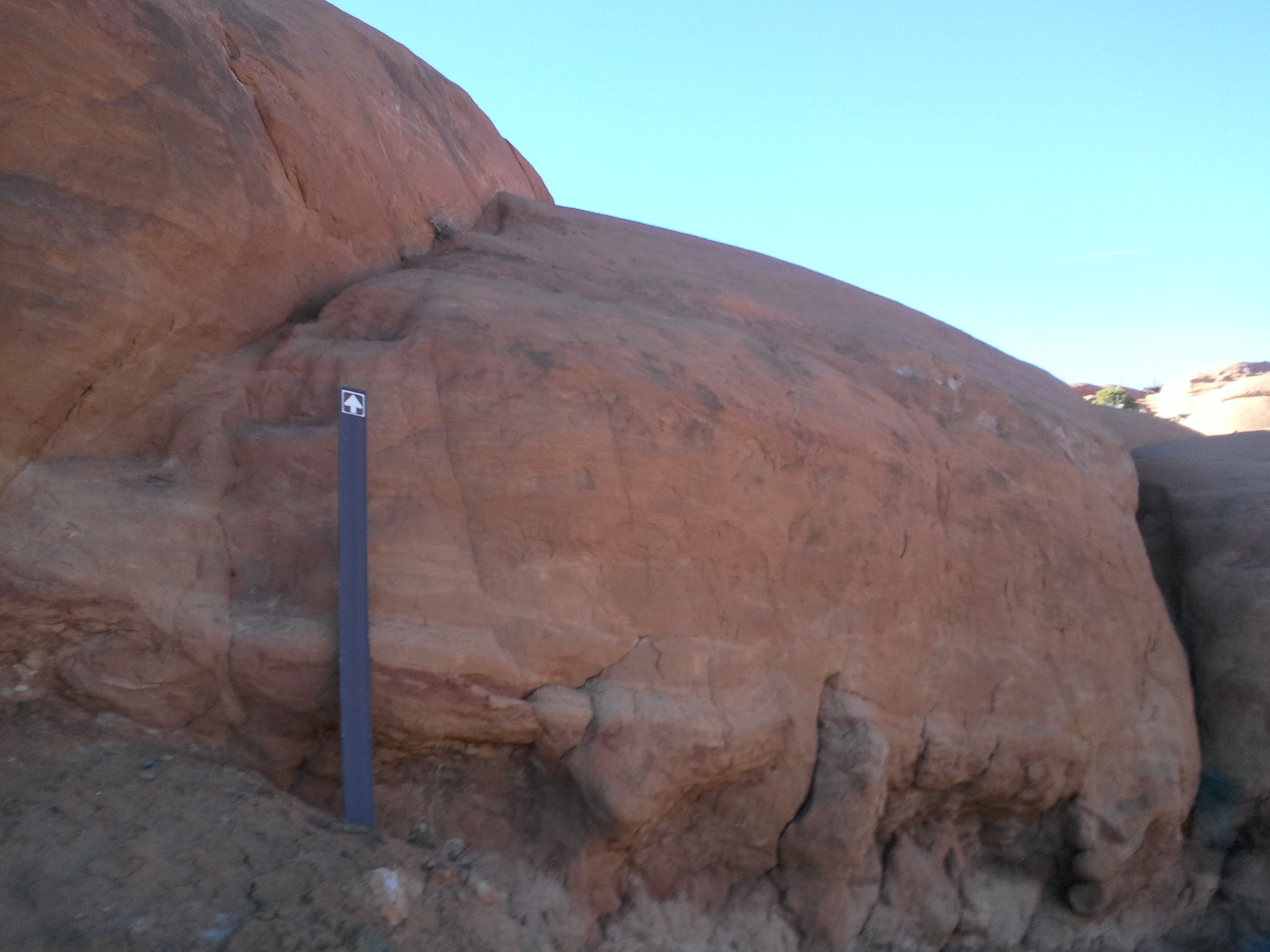 Beyond the Sentinel, continue the counterclockwise circuit around the Entrada mass, passing up and over a shady cut in the lofty orange walls. The trail beyond carefully traverses the eroding hillside, at times tilting sideways down the slope itself. Rounding another bend, an arch-in-the-making appears off to the left. 5-10 minutes beyond the Sentinel, the footpath veers due south, leaving the sandstone cliffs behind as the trail climbs out to a scenic viewpoint at the end of a ridge.