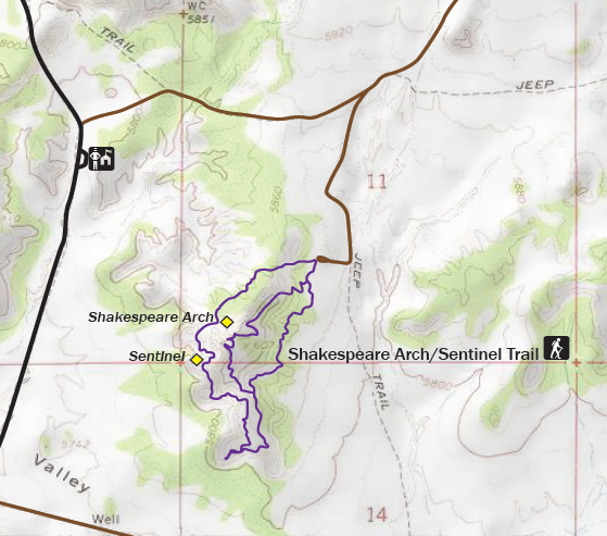 To reach the Shakespeare Arch Trailhead, turn right onto a well-graded gravel road just north of the Kodachrome Basin Visitor Center. Follow this route out of the pinyon-juniper forest and across open grasslands for 0.8 miles; turn right at the sign indicating “Shakespeare Arch.” From here it is another 0.7 miles south to the trailhead.