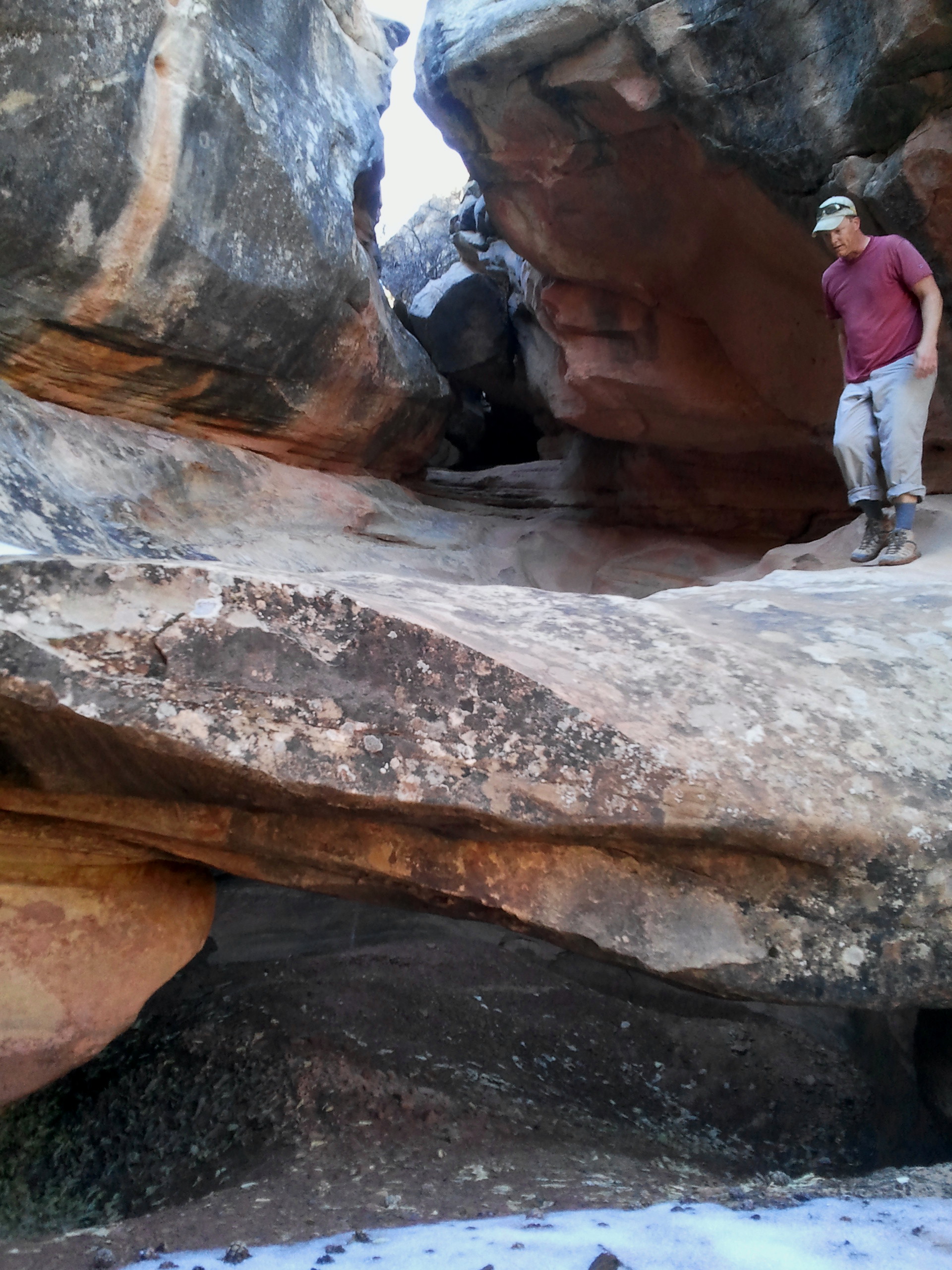 A minute or two up-canyon, an 11-foot high chockstone towers over the canyon floor. The obstacle is best circumvented through a thin crack on the right; the approach is assisted by a sturdy and well-placed tree branch that lifts climbers to a point where they can enter the notch. Squirming through the thin crack, it definitely helps to be skinny.