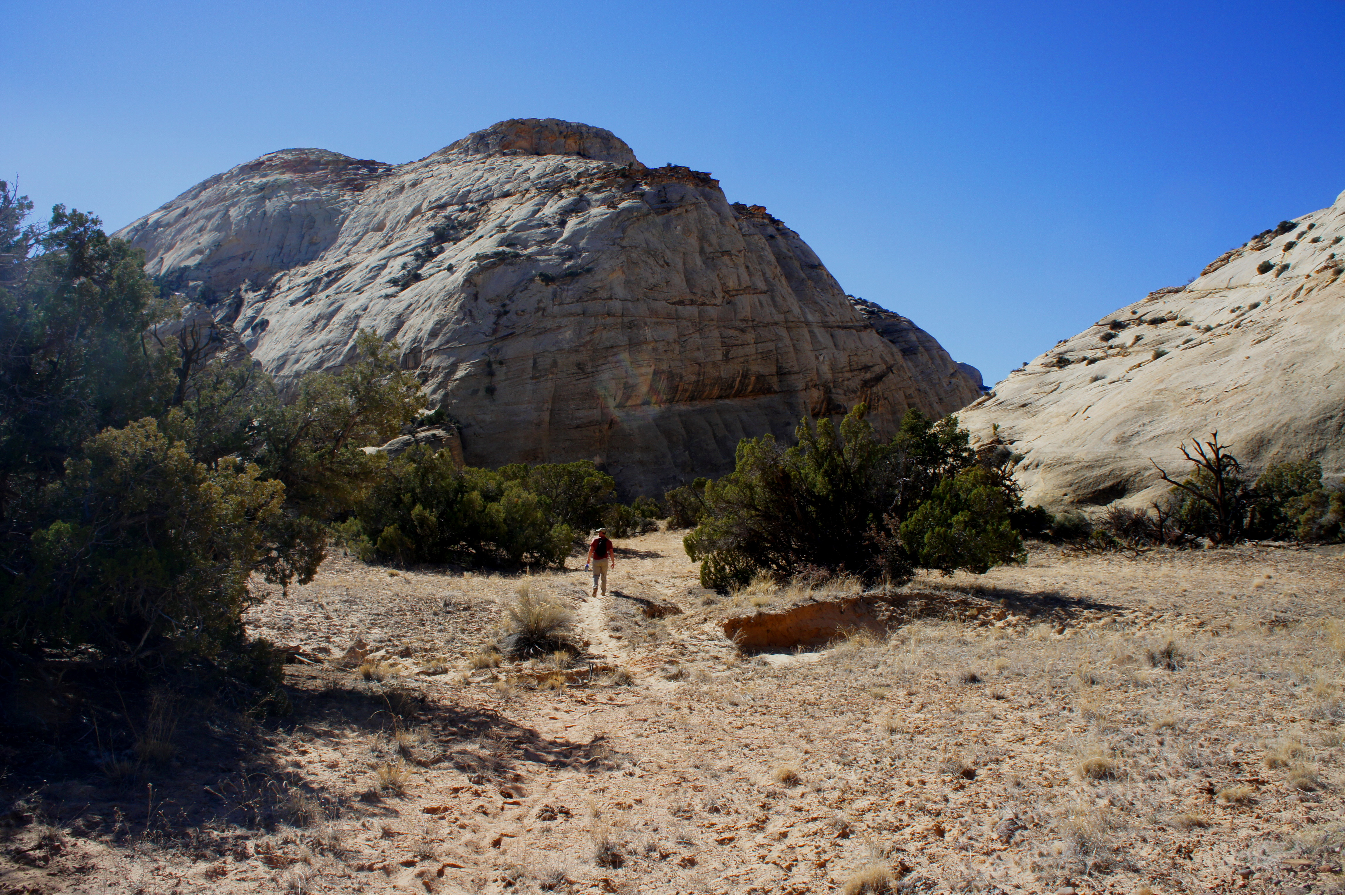 When the scenery matches this description, you will likely be on the north side of the stream. Where possible, cross to the south side and look for a well-worn, hiker-made footpath leading off into the flat. Follow this sandy trail toward a deeply-crossbedded sandstone dome, where a narrow cut in the Navajo veers off to the southwest. After maybe 200 yards, the trail drops into a dry wash. Follow this drainage upstream.