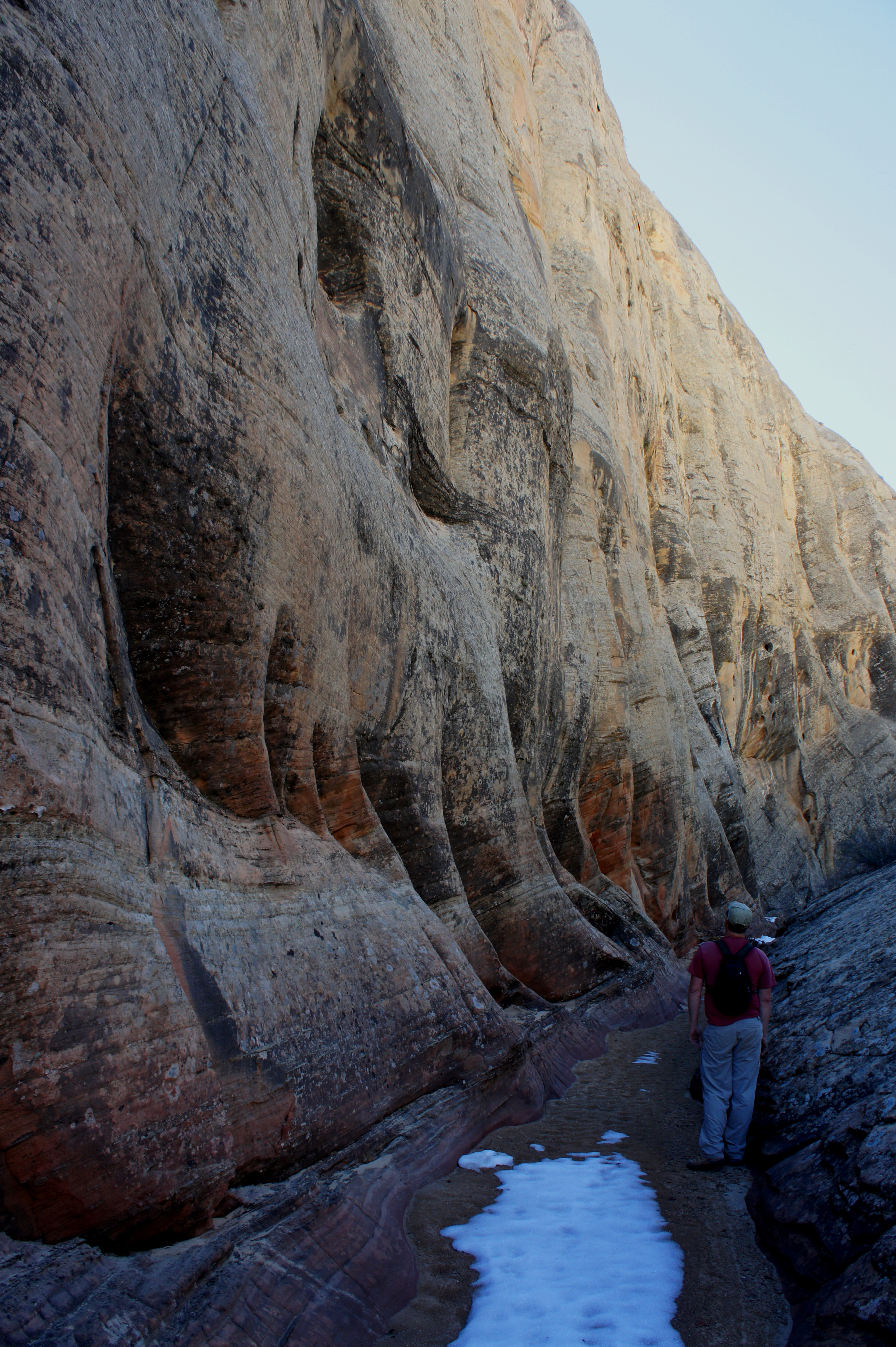 Immediately thereafter, the ravine begins to constrict; beautiful fluted cliffs adorn the left-hand wall. Around ¼ mile from Pleasant Creek, the first slot section begins. Herein lies the first potential obstacle—at the time of writing (February 2015), there was a thin pool of ankle-deep water, dammed by a minor chockstone at the end. Unless new, tall stones are placed in the pool for support, it’s hard to avoid getting your feet wet. Don’t let this deter you—wet boots are a worthy price for the scenery to come.