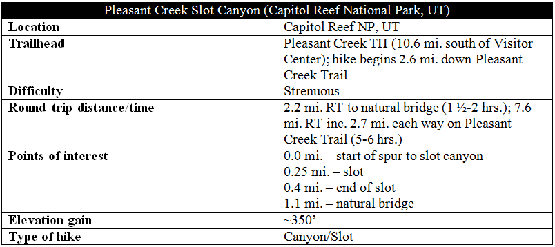 Most desert rats in Utah’s canyon country will know of Capitol Reef National Park’s three most prominent slot canyons: Burro Wash, Cottonwood Wash, and Sheets Gulch. They will also be familiar with the short, family-friendly narrows in nearby Headquarters Canyon. Much less promoted is the unnamed slot just off Capitol Reef’s Pleasant Creek, which boasts two impressive sets of narrows and at least two awesome, relatively challenging obstacles. Combined with a pleasant stroll alongside Pleasant Creek, this slot canyon adventure makes for a nice day hike in a beautiful area that sees relatively few visitors. Adventurous hikers can continue ¾ mile beyond the slot to a small natural bridge, hidden amid a series of sculpted waterpockets, or tanks.