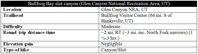 This sinuous slot canyon may not be the deepest, the longest, or the prettiest in central Utah. Visible from Bullfrog Visitor Center near the shores of Lake Powell, however, it may be one of the most accessible—and, for the non-boating types, the highlight of a visit to Glen Canyon National Recreation Area’s Bullfrog district. Though its fluted walls never rise more than 30-40 feet high, this unnamed slot through orange-colored Entrada sandstone is dark, damp, and sufficiently narrow to give pause to the claustrophobic. Despite its beautiful enclosures, ease of access, and location in a heavily-trafficked area (visitation at Glen Canyon’s Bullfrog District approached 160,000 last year), the slot remains relatively unknown. (See here for a map of the slot.)
