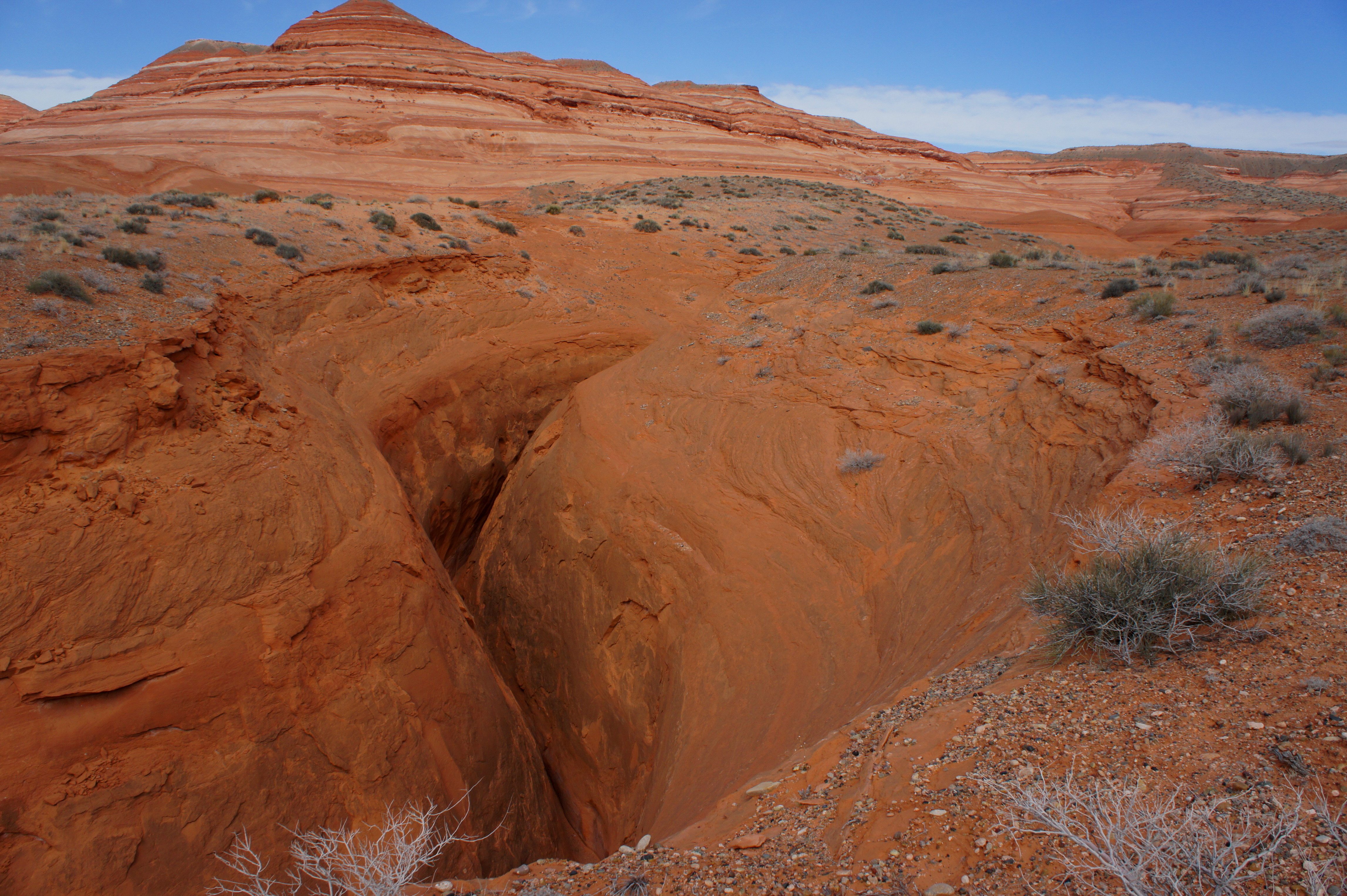 Finding the trailhead for this slot canyon adventure is quite easy: simply follow Highway 276 toward its southern terminus and park in the mammoth lot adjacent to the Bullfrog Visitor Center. The slot is 200 feet away—the obvious drainage just to the north. Accessing the slot, however, is much trickier—as the steeply-sloping Entrada prevents an easy climb to the wash bottom. A few options are available, however. Ranging from easiest to hardest, they are as follows.