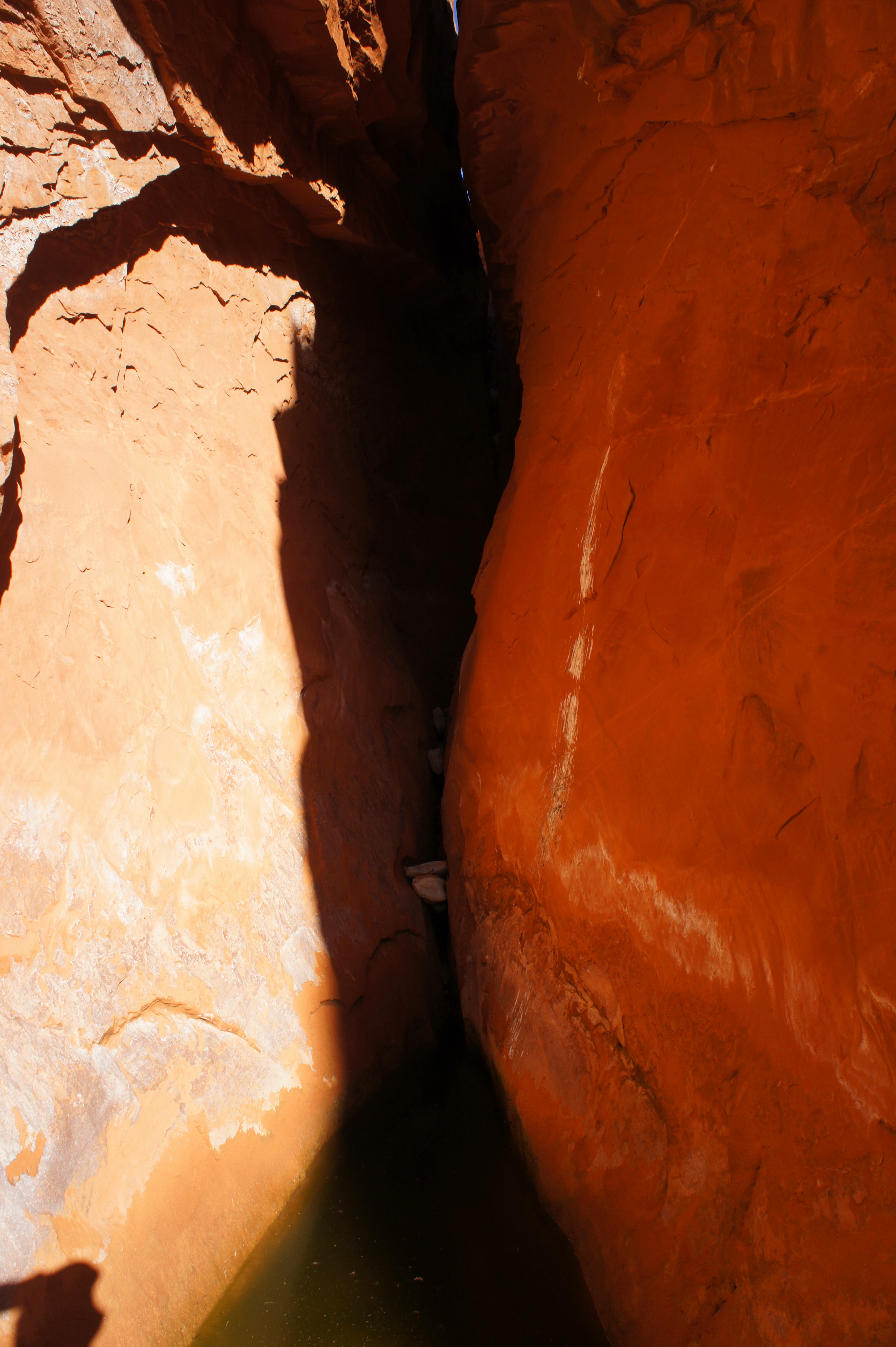 The bottom of the lower slot, at the time I visited, was guarded by a pair of two small chockstones wedged between the walls (this, of course, could change), with a thin space horizontally between them. An easier option is to chimney up and over both stones, then drop back into the slot. Aside from minor boulder jams (none higher than 2-3 feet) and some pool-hopping, there are no other significant obstacles in the slot.