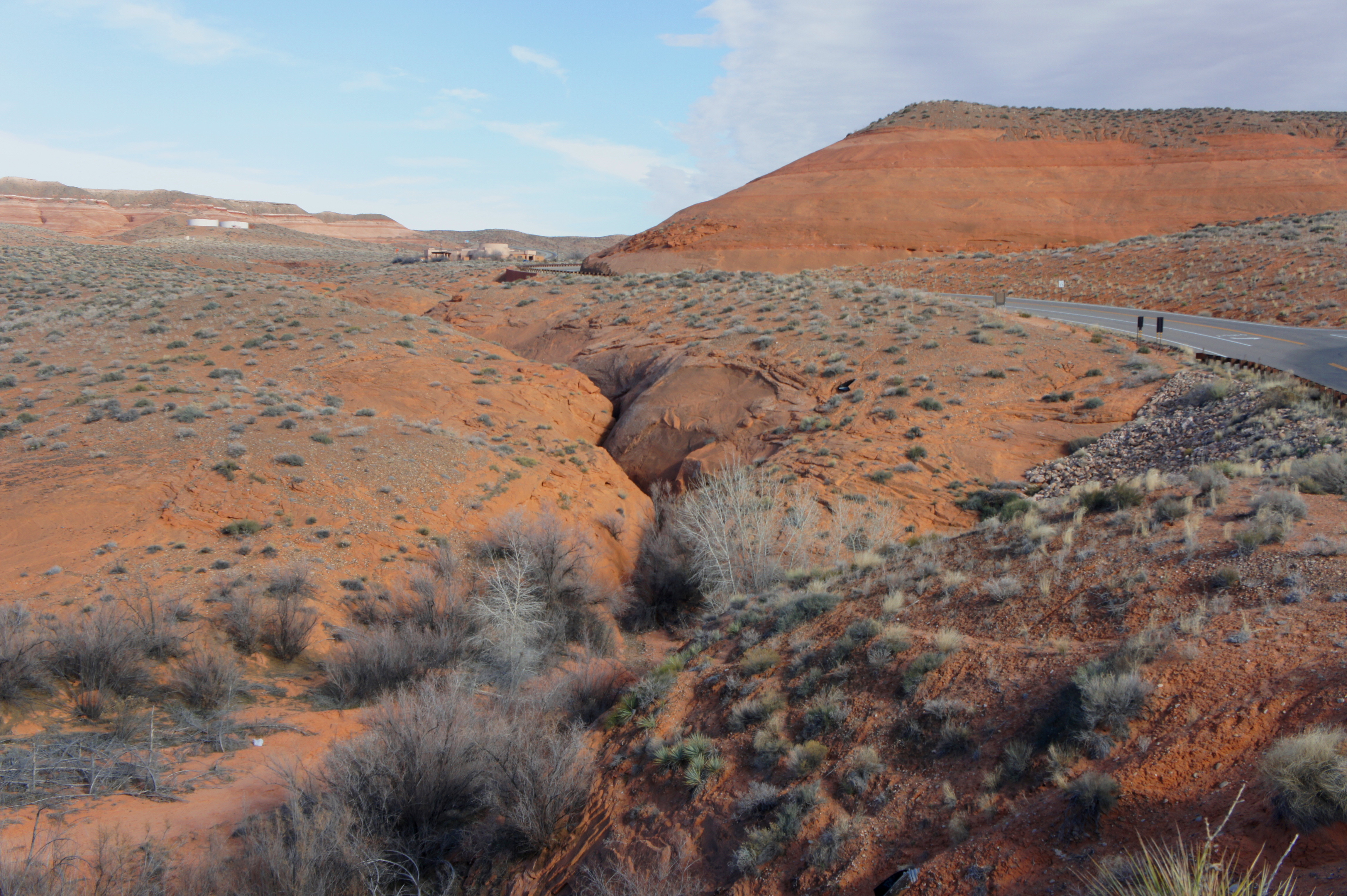 The first, least adventurous choice, is to walk (or drive) 7/10 mile up the road (west) to the Bullfrog RV Park, located atop a hill overlooking a brushy, open section of the canyon. A steep, sandy—but veritably safe—trail descends from one of the RV spots to the wash bottom. From here, turn right—passing the road and a man-made drainage tunnel on your right. The slot’s lowermost section begins shortly thereafter.