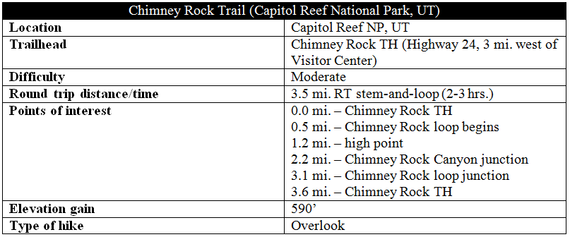 The Chimney Rock Trailhead is situated almost exactly halfway—3.1 miles in either direction—between the Capitol Reef Visitor Center and the western boundary on Highway 24. There is a small pit toilet at the parking area.