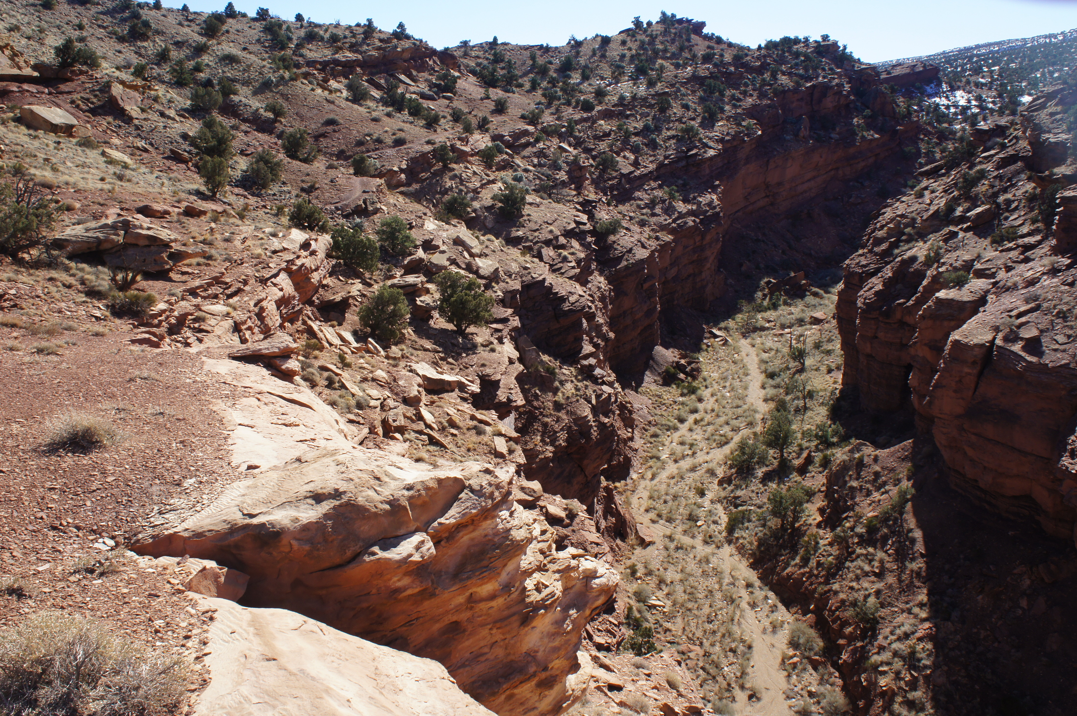 It is approximately 100 yards to a point where the footpath begins gradually ascending the left flank of a rapidly-deepening canyon, here composed of rock from the Triassic Moenkopi formation. The climb is not overly steep, but it is a persistent slog.