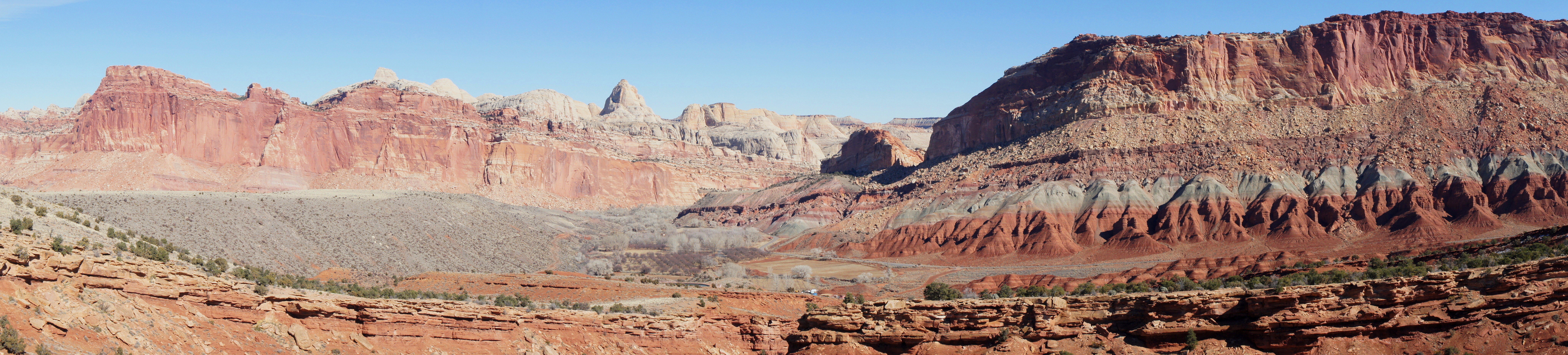 Down to the right, the river has cut a rugged canyon into the golden Sinbad limestone layer of the Moenkopi. Farther upstream, older rock strata from the Permian period—Kaibab Limestone and White Rim Sandstone—are visible, forming the bottom layers of Fremont Gorge. Across the canyon, Johnson Mesa—an example of what’s known as a strath terrace—used to form part of the valley floor, before additional down-cutting of the Fremont River and Sulphur Creek completed the landscape of today. (For a great hike across Johnson Mesa, check out the nearby Fremont Gorge Overlook Trail.)