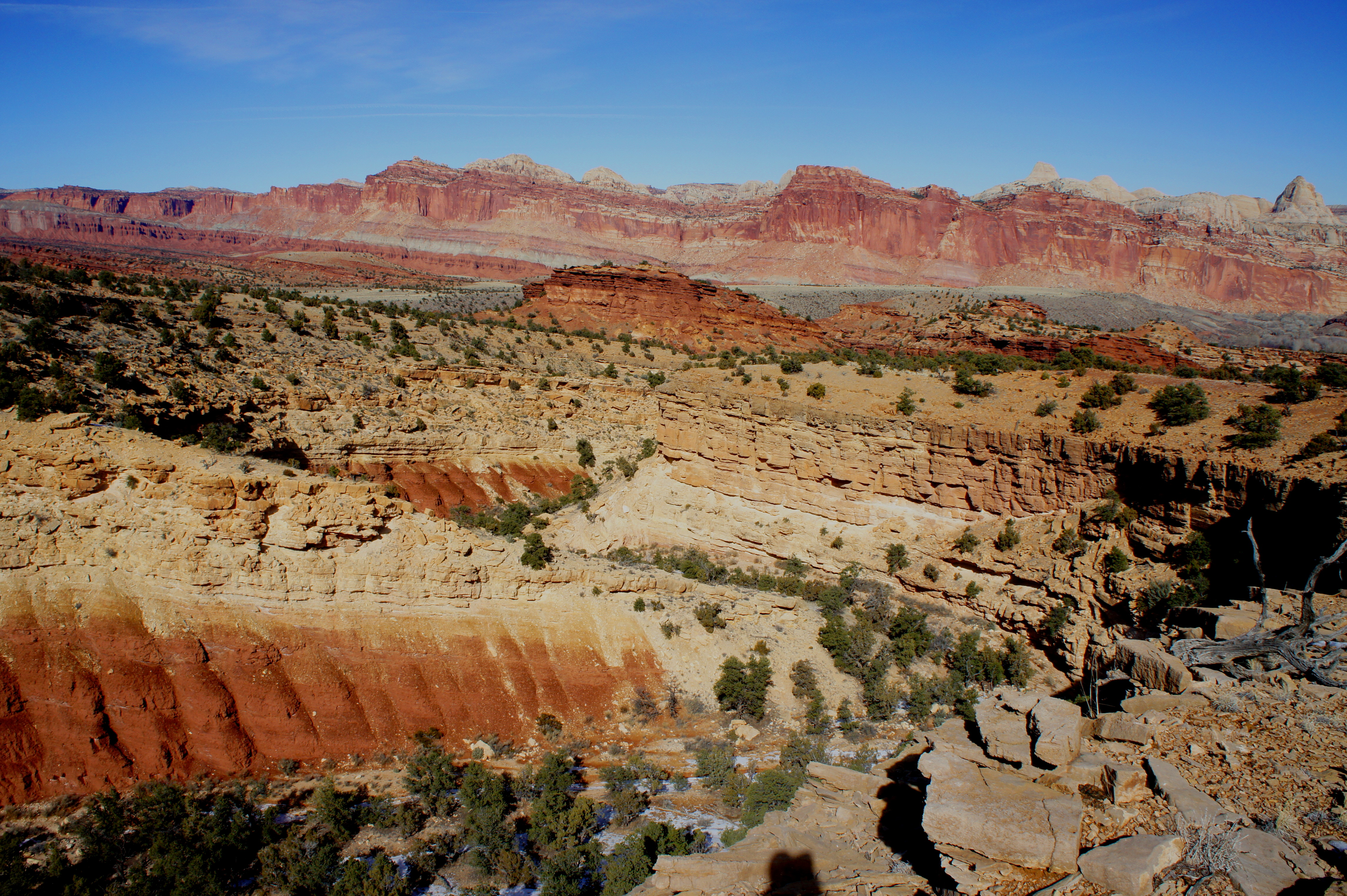 The side canyon is also impressive, but the trail does not remain beside it for long. A well-trodden trail climbs steeply to a high point on the left, but the official path continues southeast to the base of the next good-sized ridge. After zig-zagging up the west-facing slope, the trail ends at a large, hiker-made cairn. Views of the Waterpocket Fold from this spot are virtually unobstructed—beginning with the red-orange Wingate sandstone cliffs to the northeast, topped by cream-colored peaks in the Navajo sandstone. Straight ahead to the east is a continuation of the Wingate cliffs, though the vertical walls here quickly give way to boulder-strewn talus slopes—and then two horizontal strips of green-gray and deep red badlands (Chinle Formation and Moenkopi Formation, respectively). Back to the west, the dip slope of Miners Mountain (~7,900’) gradually rises to the fill the horizon, but rocky canyons add gradations to the landscape.