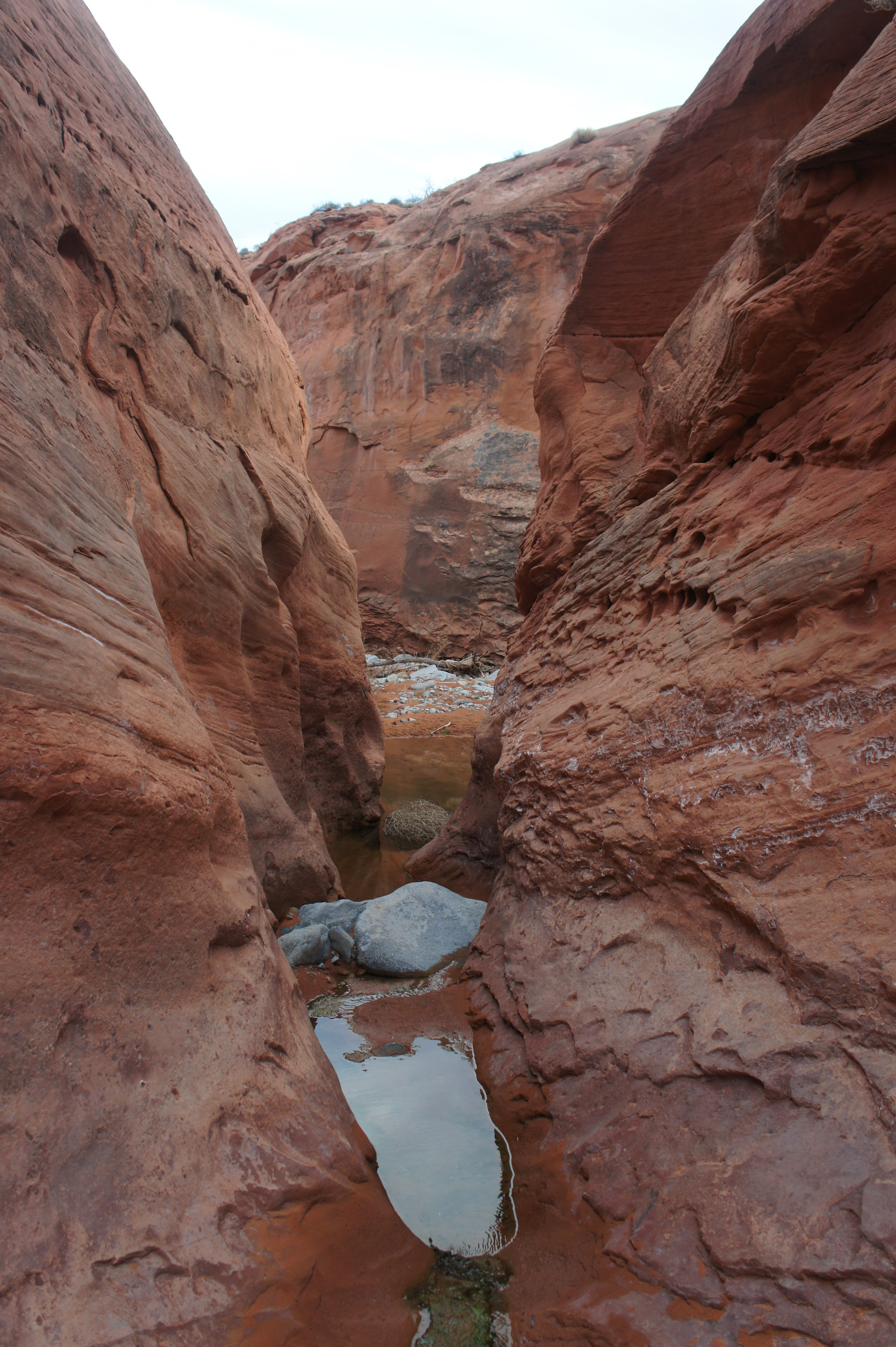 At about the 1 ¼ mile mark, the canyon widens to about 30 feet across, and the sudden appearance of tall cottonwood trees usher in the end of the narrows section. Tall grasses line the wash bottom, and a spring-fed stream appears. The gorge briefly chokes up again just before a nasty pool, which appeared at least 3 feet deep when I visited in February 2015 (this was after a significant dry spell; after winter snow or flash floods, the water levels are likely to be higher).