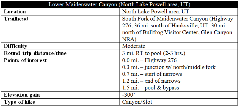 The remote Trachyte Creek drainage system—just east of Utah’s Henry Mountains and north of Lake Powell—comprises a flurry of narrow canyons, many thin enough to form slender slots. One of the area’s best day hikes is Lower Maidenwater Canyon, easily accessible from Utah Highway 276 to Bullfrog Marina. The road roughly bisects the canyon into two sections: three challenging upper forks to the west (requiring technical canyoneering gear) and a more manageable, non-technical lower gorge. Though it rarely thins to a tight slot, Lower Maidenwater boasts a half-mile stretch of beautiful, curving narrows. Hikers may combine Maidenwater with nearby Trail Canyon to complete a roughly 7-mile loop, though the first 1.5 miles of Lower Maidenwater (before a deep pool with a sketchy bypass) are the highlight.