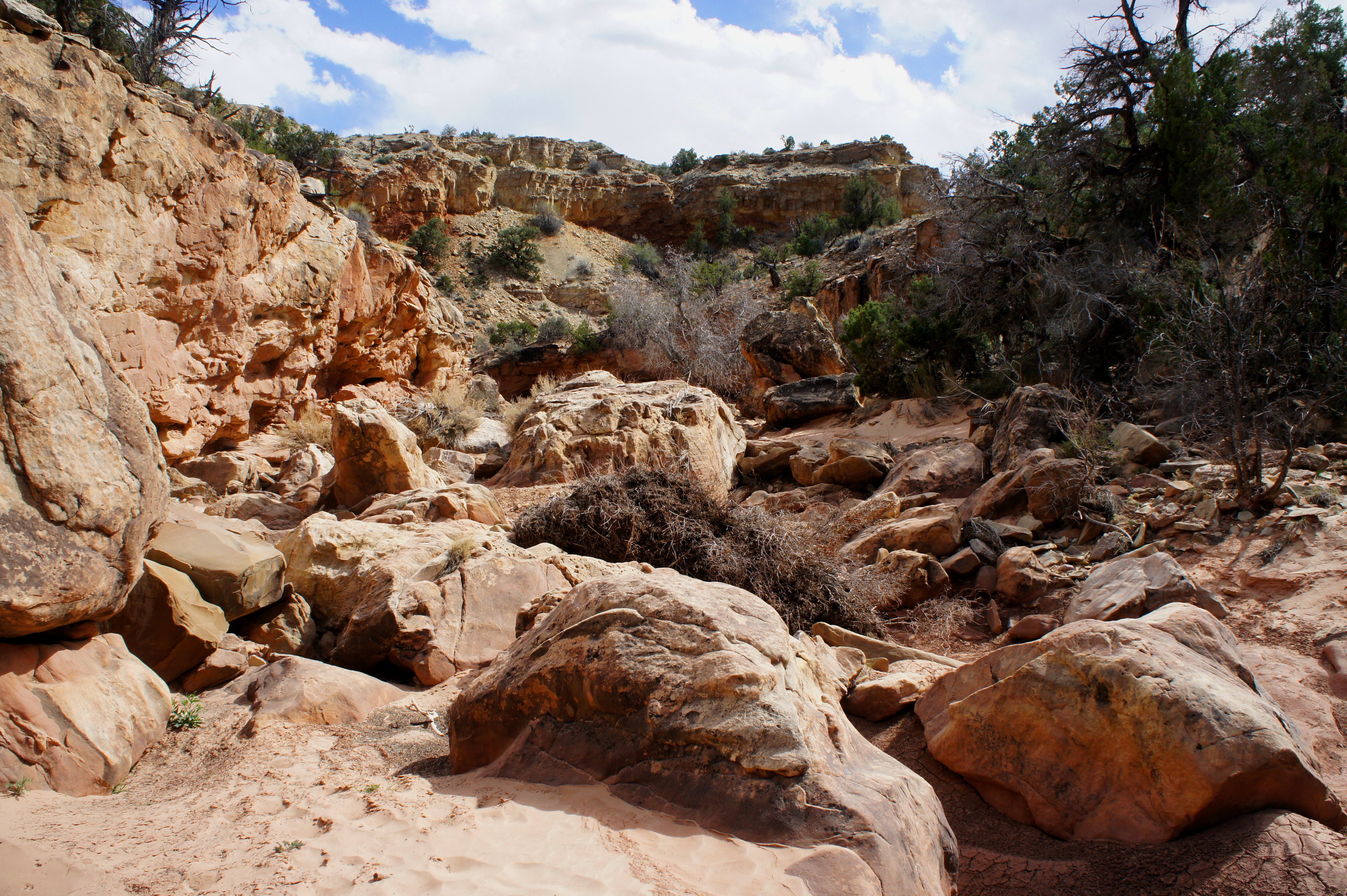 Level with the fourth pouroff, hikers will face a choice: continue upstream through the rock-strewn gulch, or catch a hiker-made bypass route that ascends the left-hand slope. Most will elect for the bypass, but at 50 feet above the canyon bottom, it is relatively exposed in places. Following the wash bottom requires skirting three considerable boulder jams, followed by an 8- to 10-foot pouroff (surmounted via a ledge system on the left). The bypass route returns to the wash just above this dryfall.